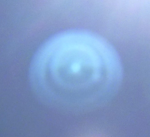 My 5D soul aspect (Rowena) brought through this information during meditation two days ago, with the image of a pink Rose opening in my Well of Dreams Chakra. I then started to see blue flashes between my eyes, which she defined as the opening Pituitary Chakra. She worked with me further that night during a dream, and then sent a ‘visual message’ yesterday via the camera lens. In the photos below, she’s commandeering refraction to show the exact colours to use in the chakras, and their relative positions. in the first photo, she used an arrow, showing where to focus. (Her ship is the semi-decloaked white shape left of the Sun, with a darker round portal in between the ship and Sun).