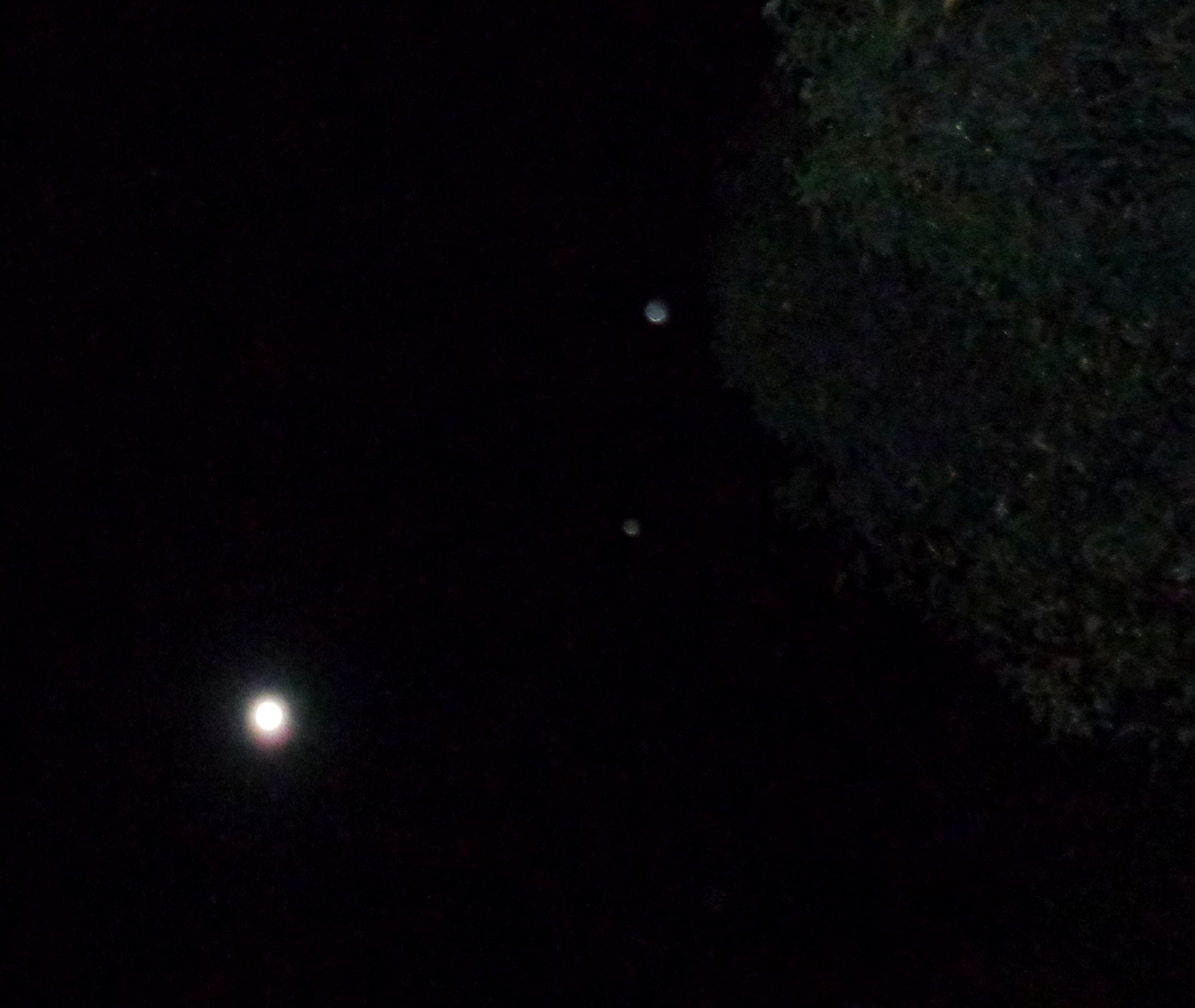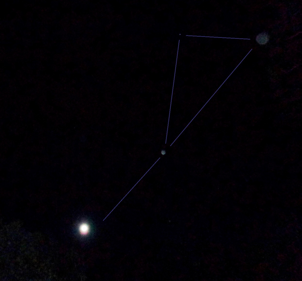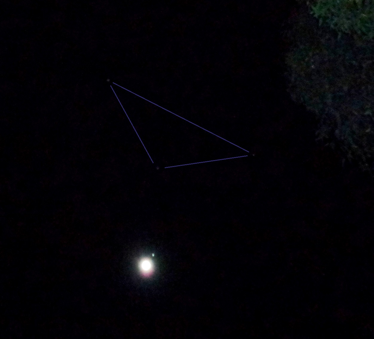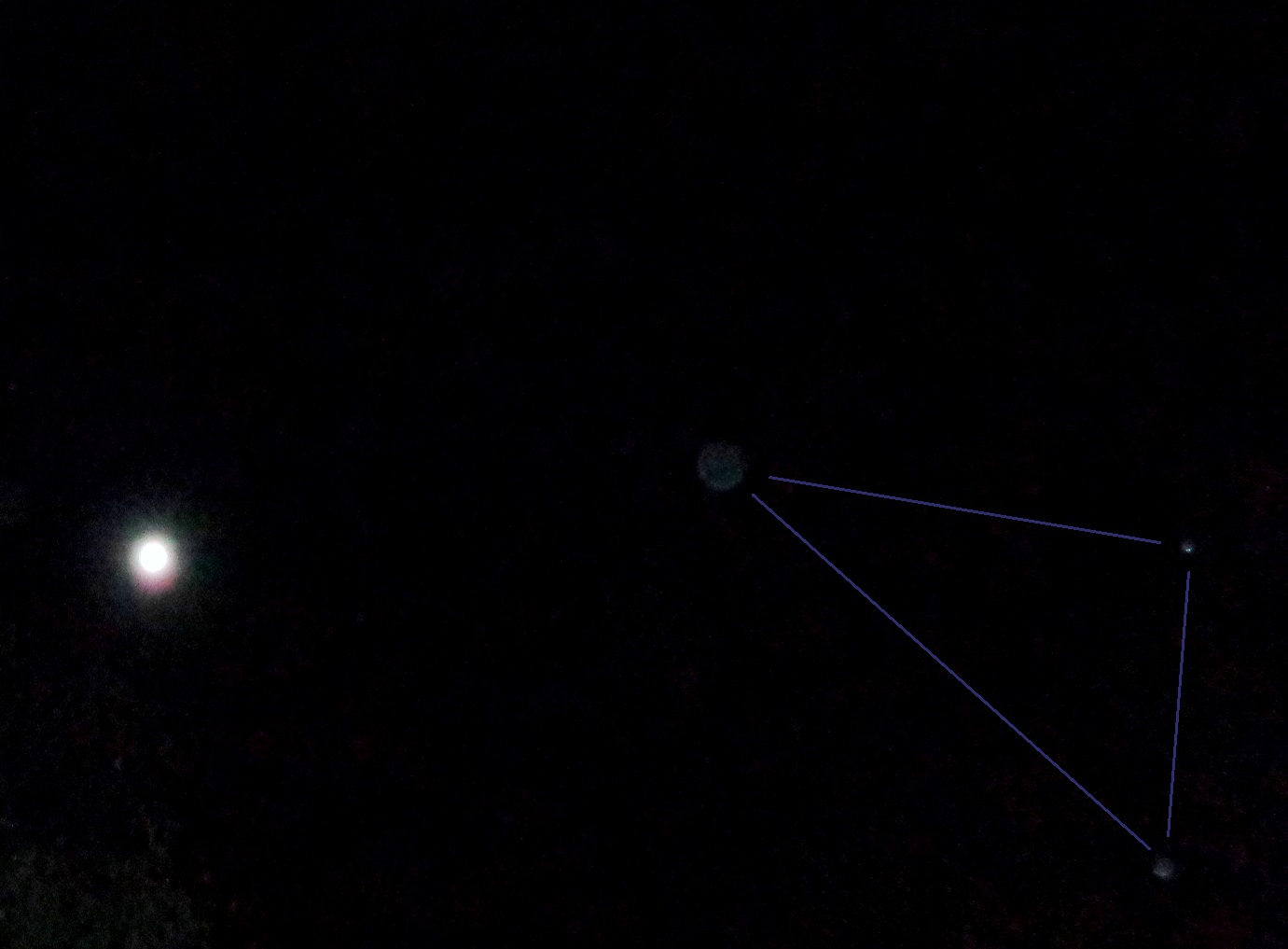 One of the two small orbs can be seen faintly here too, making a second triangle, with the Moon – overall, forming an elongated butterfly-type shape.