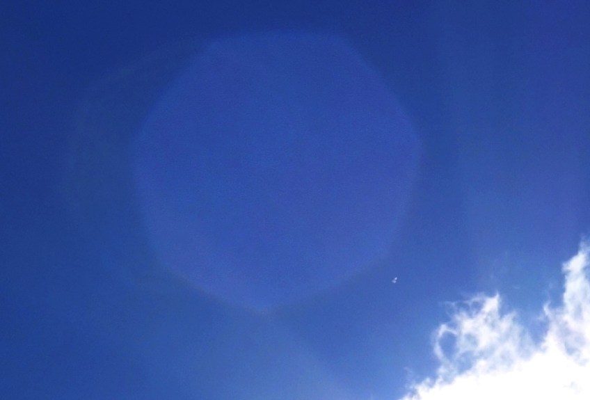 dsc06833-copy-copy-2 Published October 20, 2016 at 1035 × 702 in Aligning Meraia’s Star Carian (birdlike beings) lightship flies below a heptagonal lens flare, September 6, 2016.
