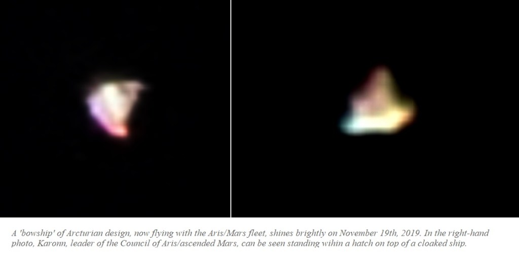 Our star brothers and sisters based within the 5th-6th dimensional stratas of Venus have been approaching humanity (and Earth governments) since the 1950s, led by Valiant Thor, and in the photos below you can see a beautiful luminous ship of Arcturian design, that flies with a fleet currently supporting ascended Mars/Aris (which like Earth, has been caught in dualistic control-type energies, but has lifted in vibration, with a 5D civilization flourishing there within a stabilized location). On the right, the golden-brown being in matching attire standing in an open ‘hatch’ (in the roof of a cloaked ship) hails as Karonn, leader of the Council of Aris(Mars).