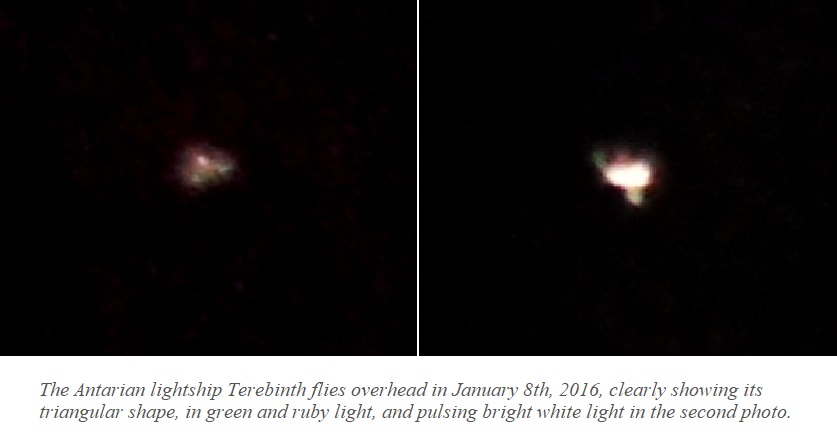 Among our soul kin and starry friends, J’errene’on, captain of an Alpha Centaurian ‘wing’ of the fleet, often sends a visual flash of his ship overhead. An Antarian star sister Tayitha captains the Terebinth, the beautiful lightship in the photos below, which often patrols overhead here. Higher dimensional lightships aren’t ”fixed forms” as we perceive forms in this plane, and the Terebinth for instance appeared firstly in my dreams in a translucent rainbow crystalline form, then at close range over the house at night as a triangular form in 2016, and over the years since then, in diamond form, or morphing between the two.