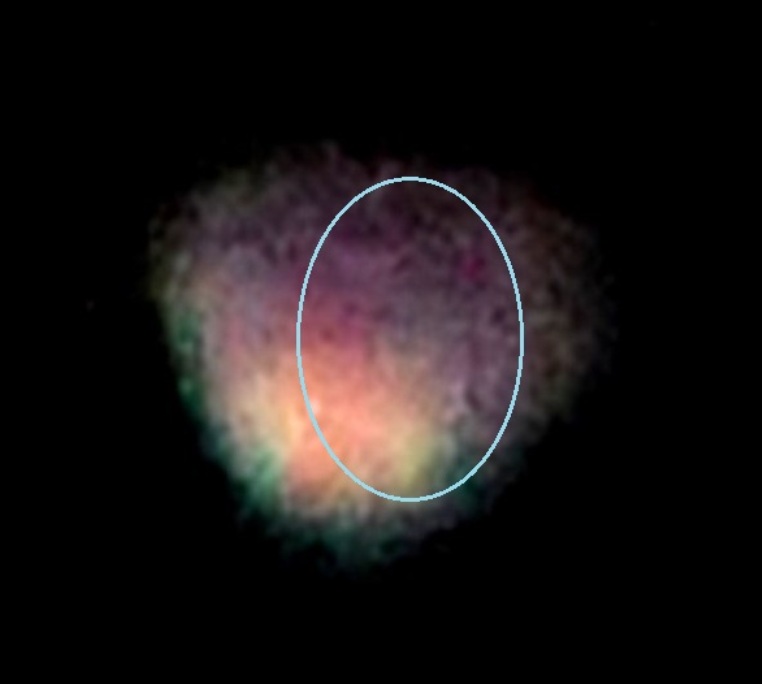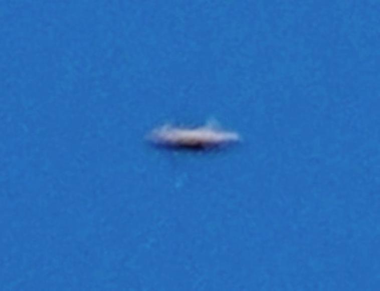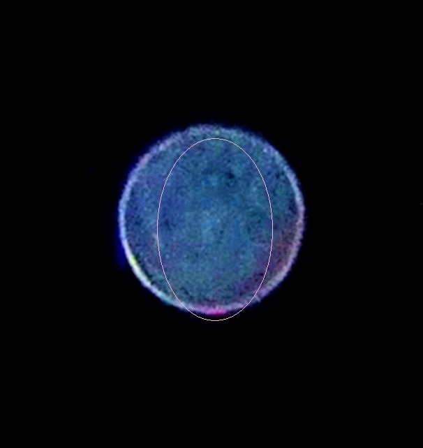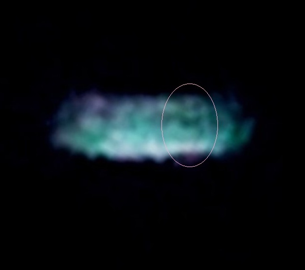 In the enlargement below, the Meri’Ashar’s shimmery disc shape of white light, infused with aqua and rimmed in rose-violet light is softly defined, with two ships docked beneath. In the circled areas, there’s a large rectangular ship, attached by a ‘ramp’ of light beams to the underside of the mothership, with a smaller white round ship stationed to its left.