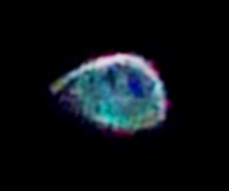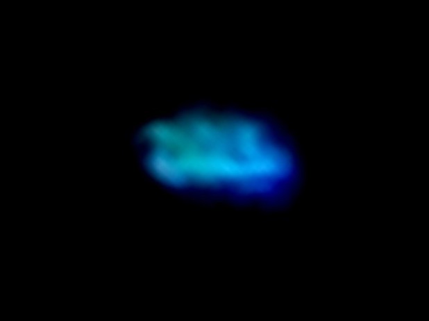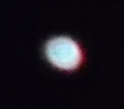A second lightship gave a couple of very quick flashes closer to Jupiter and Saturn, while coordinating with the Amrita. Here you can see this ship coming down toward Saturn from above, and in the enlargement below, its rounded oval shape is filled with soft rainbow light colours. This ship hailed as a Venusian lightship, one of a fleet connected with the beautiful rainbow mothership Aurora, now coming in closer to the Earth.