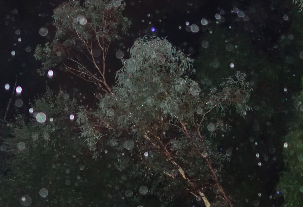 Purple-blue soul orb of Sirian & Hyadean vibrations appears above a tree amidst rain orbs and droplets, May 4th 2020.