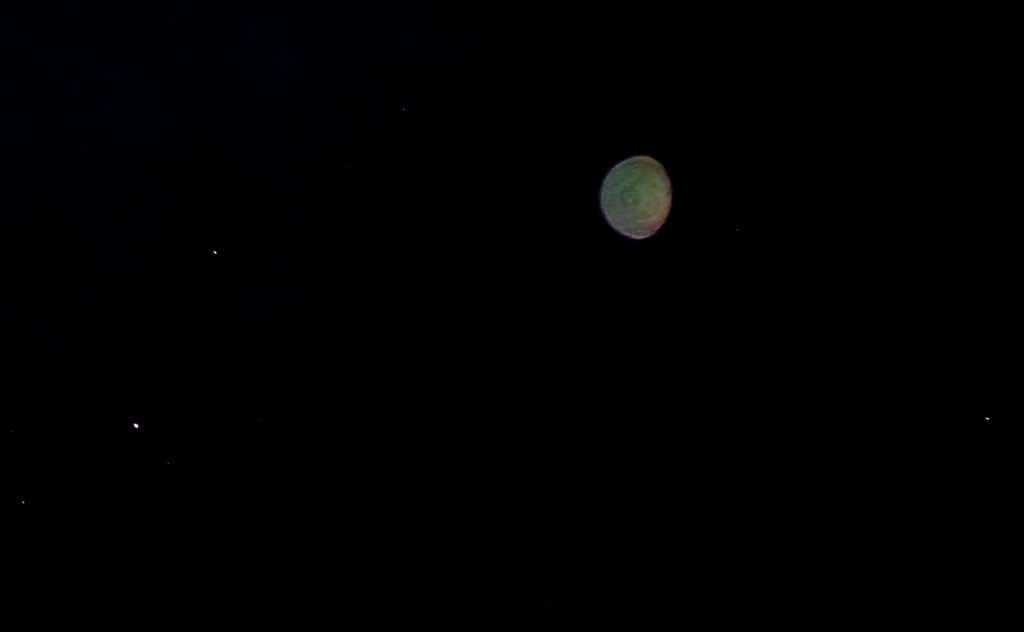 After a big night on the 10th, the following night I took this photo of Mars, showing the hint of a face in peachy-golden light in the centre, with grids visibly peeling away, like fencing being removed, at the right-hand side (see previous post Mars Mission Update for more about this transformation-in-progress).