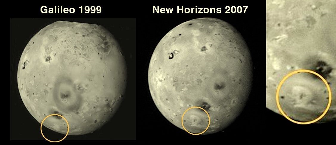 These comparison photos of Io, taken in 1999 by the Galileo spacecraft and 2007 by the New Horizons spacecraft, reveal a very interesting change, with the formation of an Omega symbol in the circled area of the later image. Notice the bottom of the Omega is sealed in this 2007 photo…it would be interesting to see how the gateway looks in a current photo.