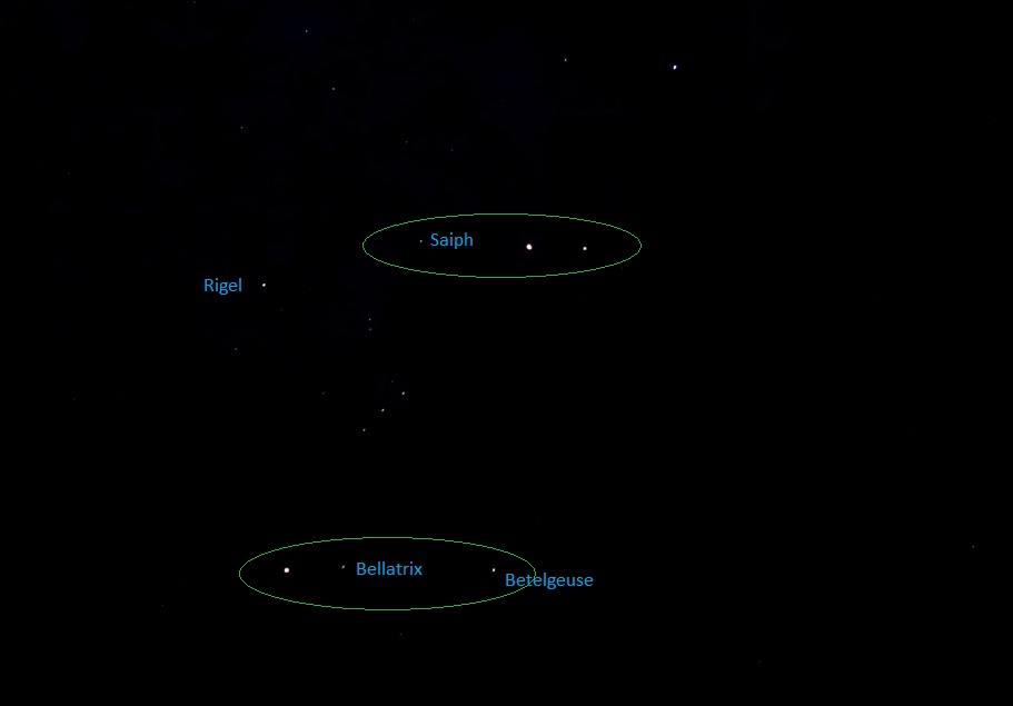 The following night, January 30th, activity was focused around Orion again; in the photo below, two ships flashed together in an angled alignment to Bellatrix.