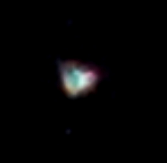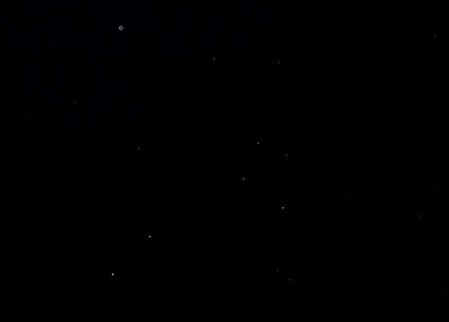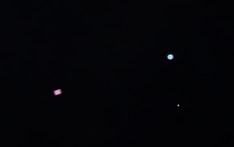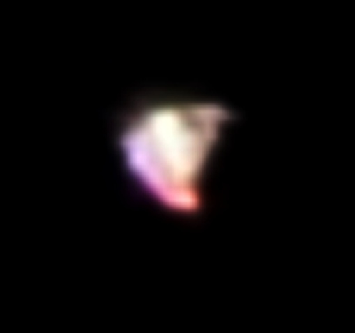 On September 12th, this glorious ship from Polaris flashed as a very bright rectangular ship close to a star named Fomalhaut (see this post for context), then drifted slowly south-east behind a tree, still visivble between the branches, until it winked out/recloaked (right at the bottom of the frame in the third photo). In the enlargement below, with the brightness reduced, the rainbow spectrum of colours are incredibly beautiful, with faces visible, especially of a beautiful golden seal-like face with large eyes and an emerald light on her third eye, who hailed as Miniwe’ha, an ambassador from the Polarin High Council.