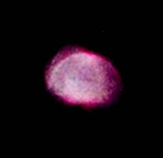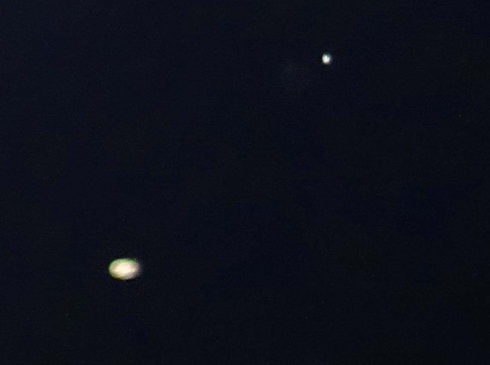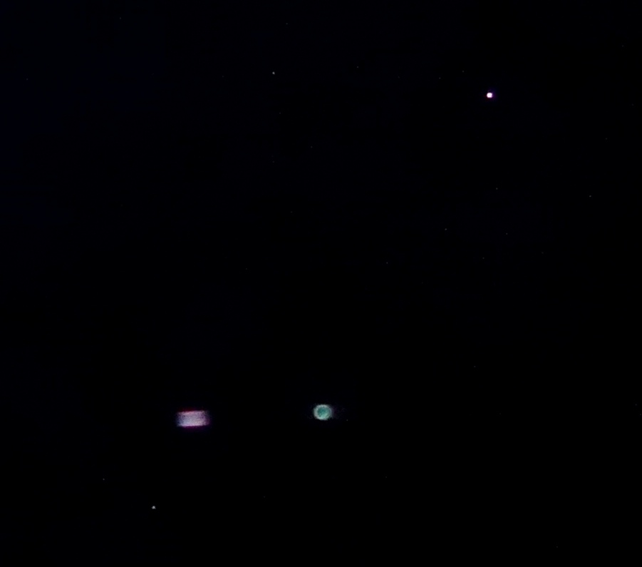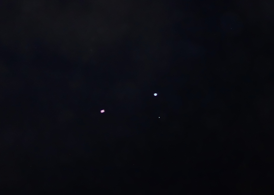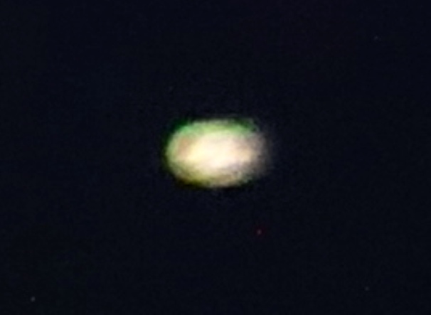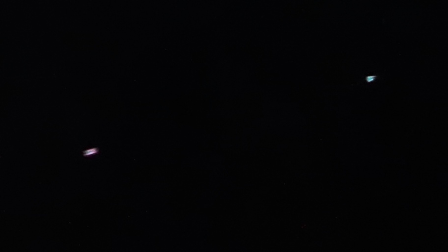 On the night of June 6th 2019, a series of purple flashes flickered across the nightsky, and this beautiful ‘flying saucer’ shaped ship of rose and blue-white light appeared where one the purple flashes had been, whizzing east to west across the sky, with a small pod/scout-ship trailing it to the right, and in the second photo catching up as it passes below the larger ship.