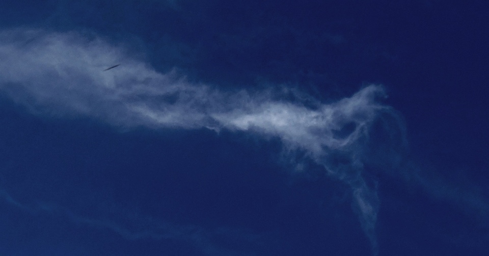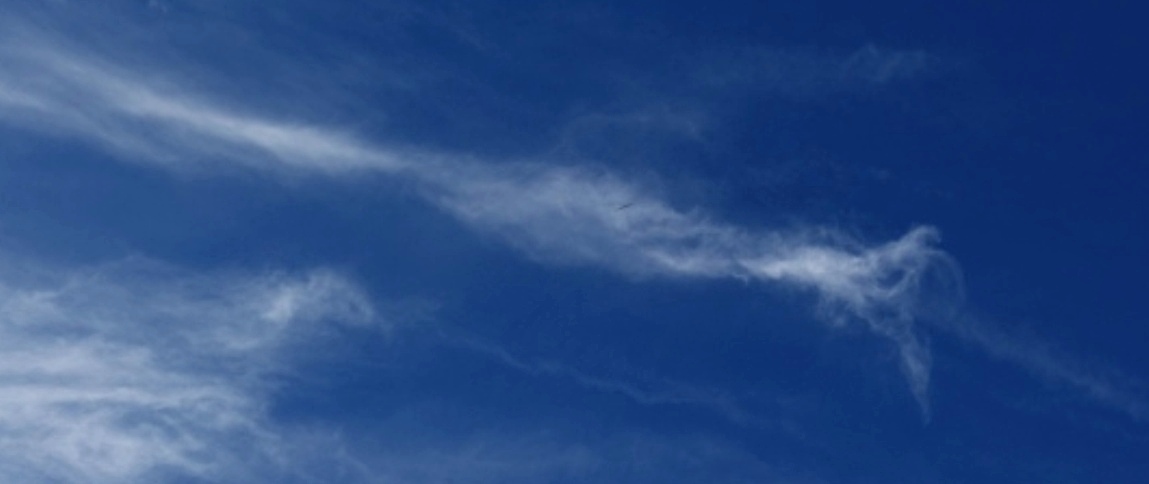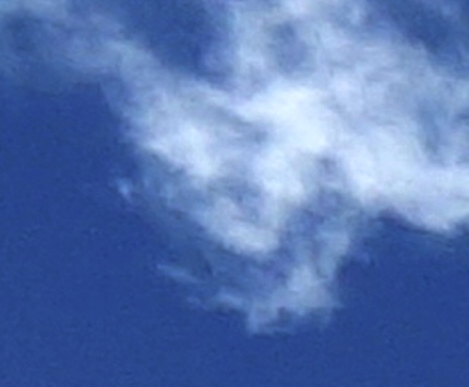 North of the pagoda, the form of a running or flying horse (representing Alpha Centaurian star family presence) appeared at the tip of a cloud streak, and behind the horse a black (lower vibrational 4D) ship popped into view as the Alpha Centaurians led it away from the Earth into what star family describe as a ‘light containment field’. In the enlargement, you can see a slight trail behind the ship, and a shadow of its shape in the upper left of the cloud streak, where it crossed dimensions and became visible.