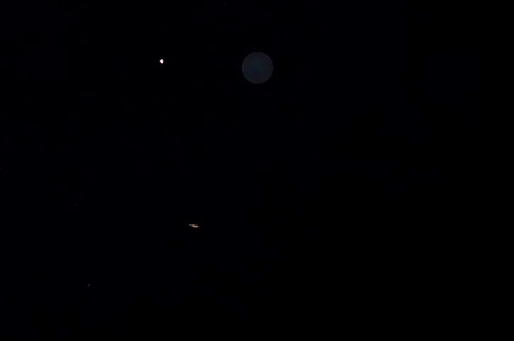 The next night, September 13th, there was another beautiful appearance to the lower west of the Moon, followed by a pair of ships flashing on a horizontal alignment close above the Moon (these appearances are visually signalling various missions and assignments underway where and when the ships decloak, and the specific beings and groups focusing/working together at various moments). In the enlargement below, three figures are clearly visible, with Ashura (my Twin Flame) at the left, standing slightly forward, a being in green in the middle, and another in white at the right (with soul light/vibration of Mira of the Pleiadian High Council coming through).