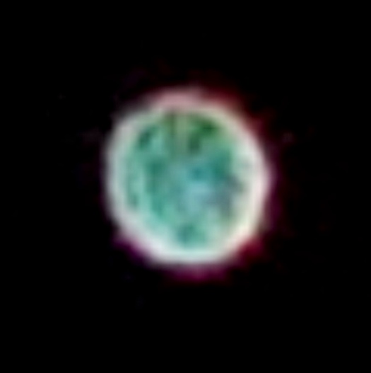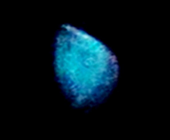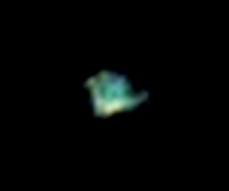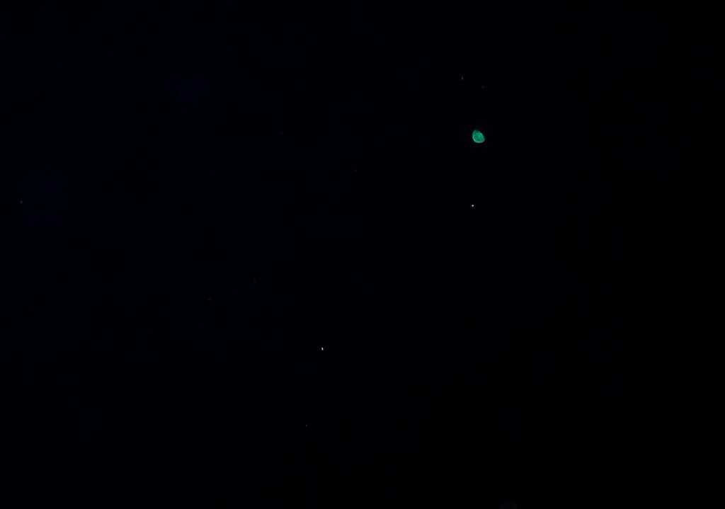 This beautiful deep blue-green lightship hovered in alignment to the ‘Pointer’ stars Alpha and Beta Centauri on August 24th (faces can be seen ‘projecting’ through its light in the close-ups below) – the stars are at lower right, ship upper left (see this post for more info).