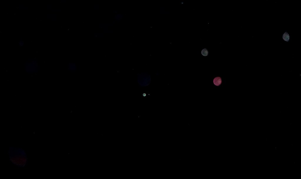On December 21st (the Solstice alignment), the Meri’Ashar projected this blue-green orb in front of it, with an Arcturian bowship flashing white above it, inbetween the stars Canopus (left) and Achernar (right)….the blue-greens are radiating from the Canopan and Achernarian aquatic beings attending a meeting on board the Meri’Ashar. In the enlargement below, standing figures are visible around a central table.