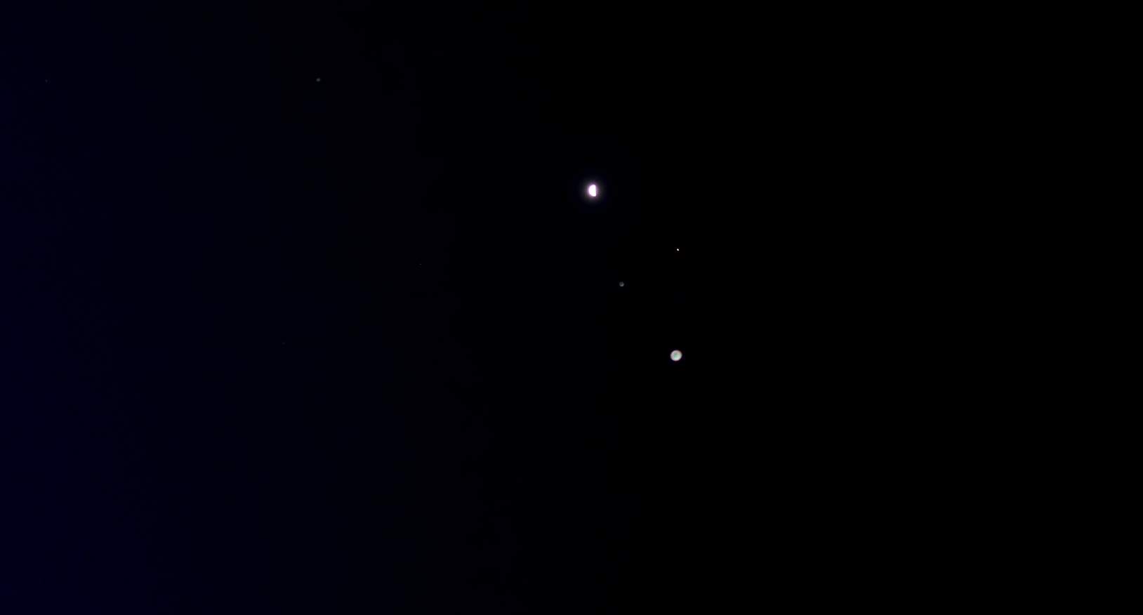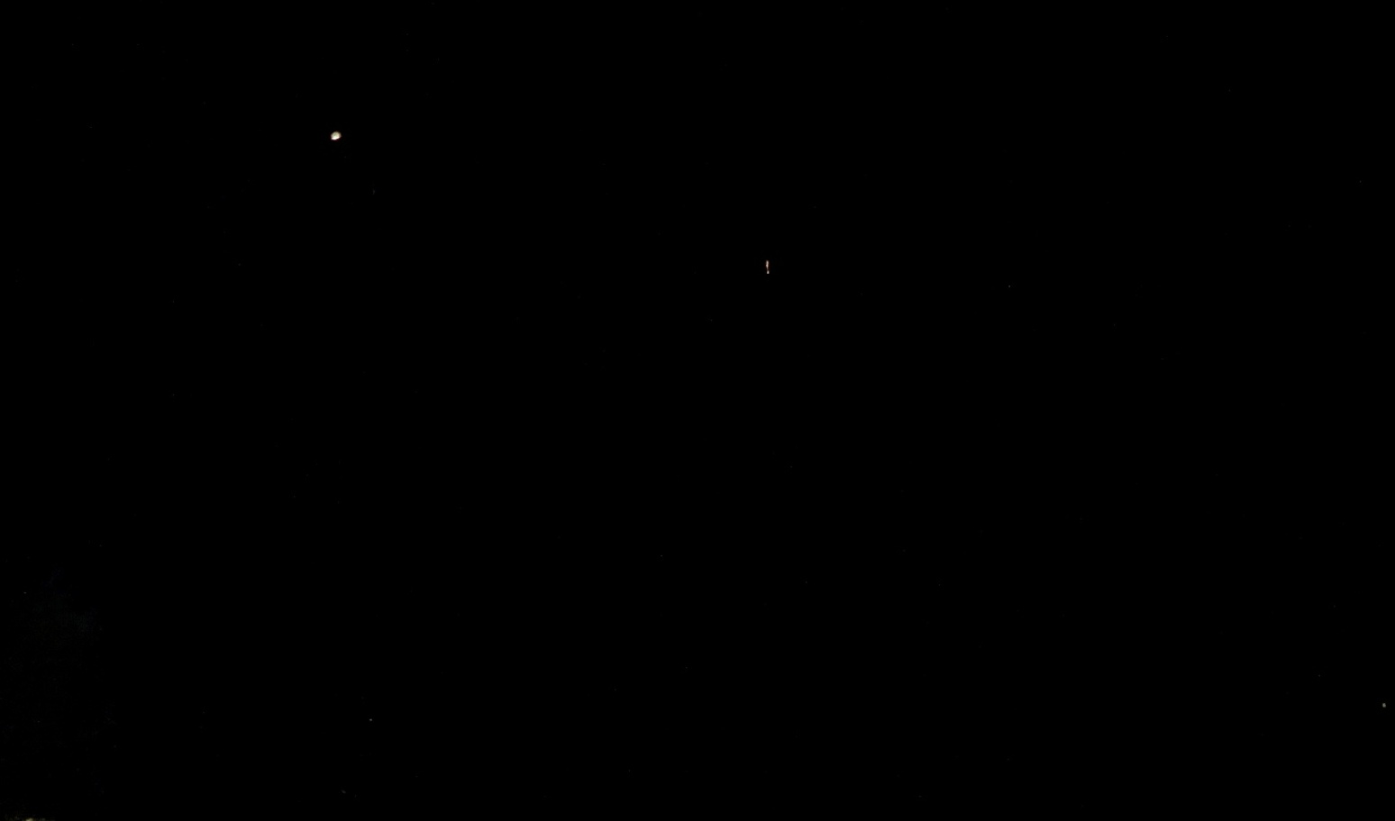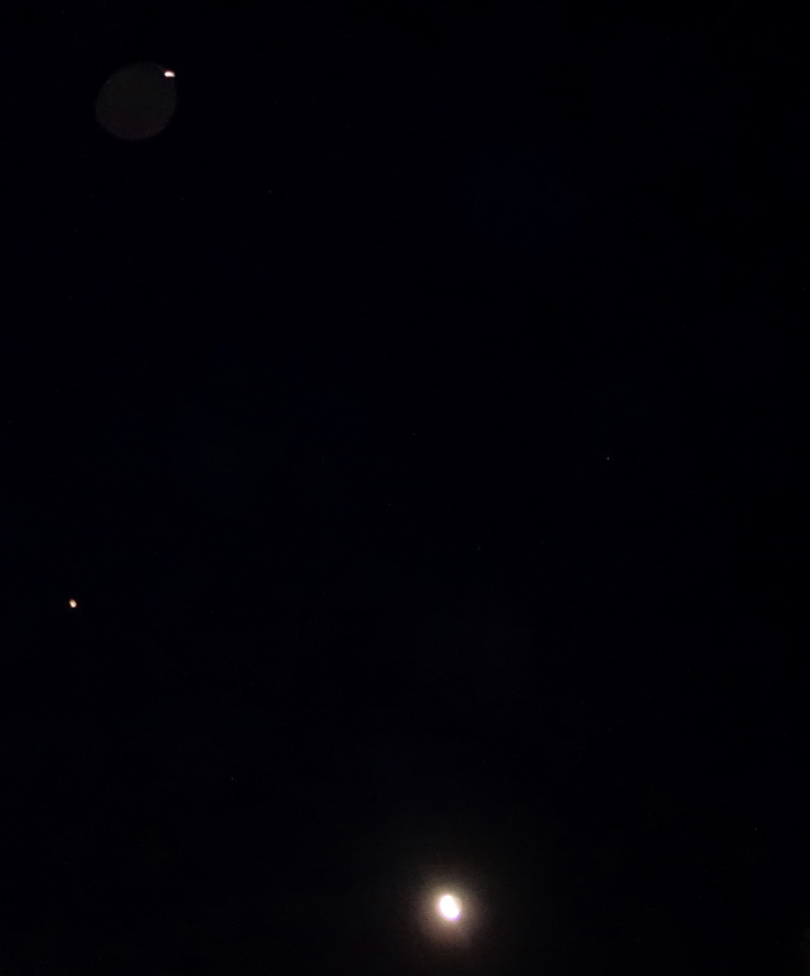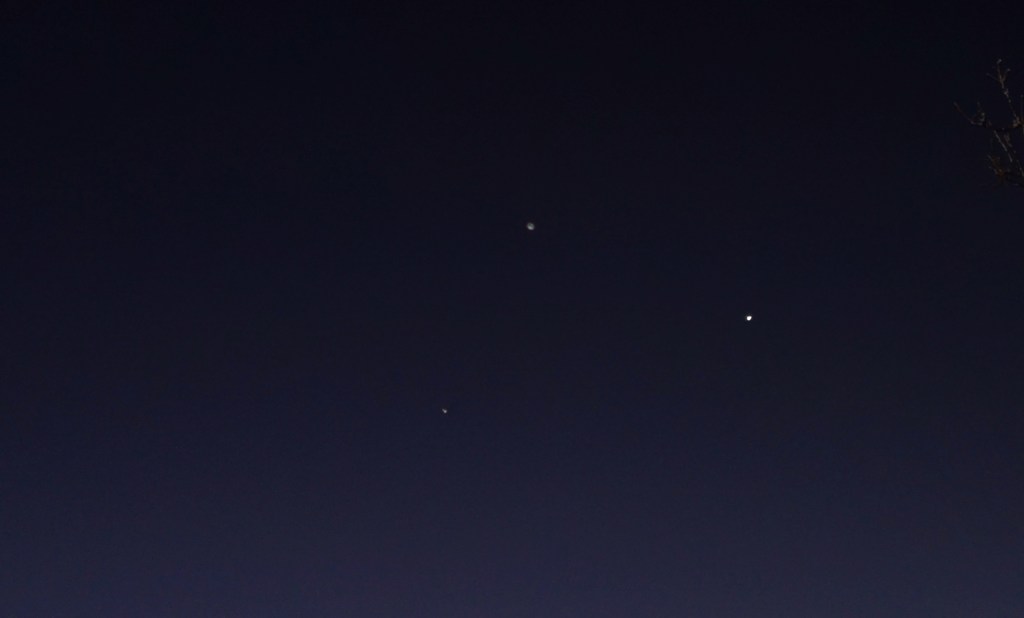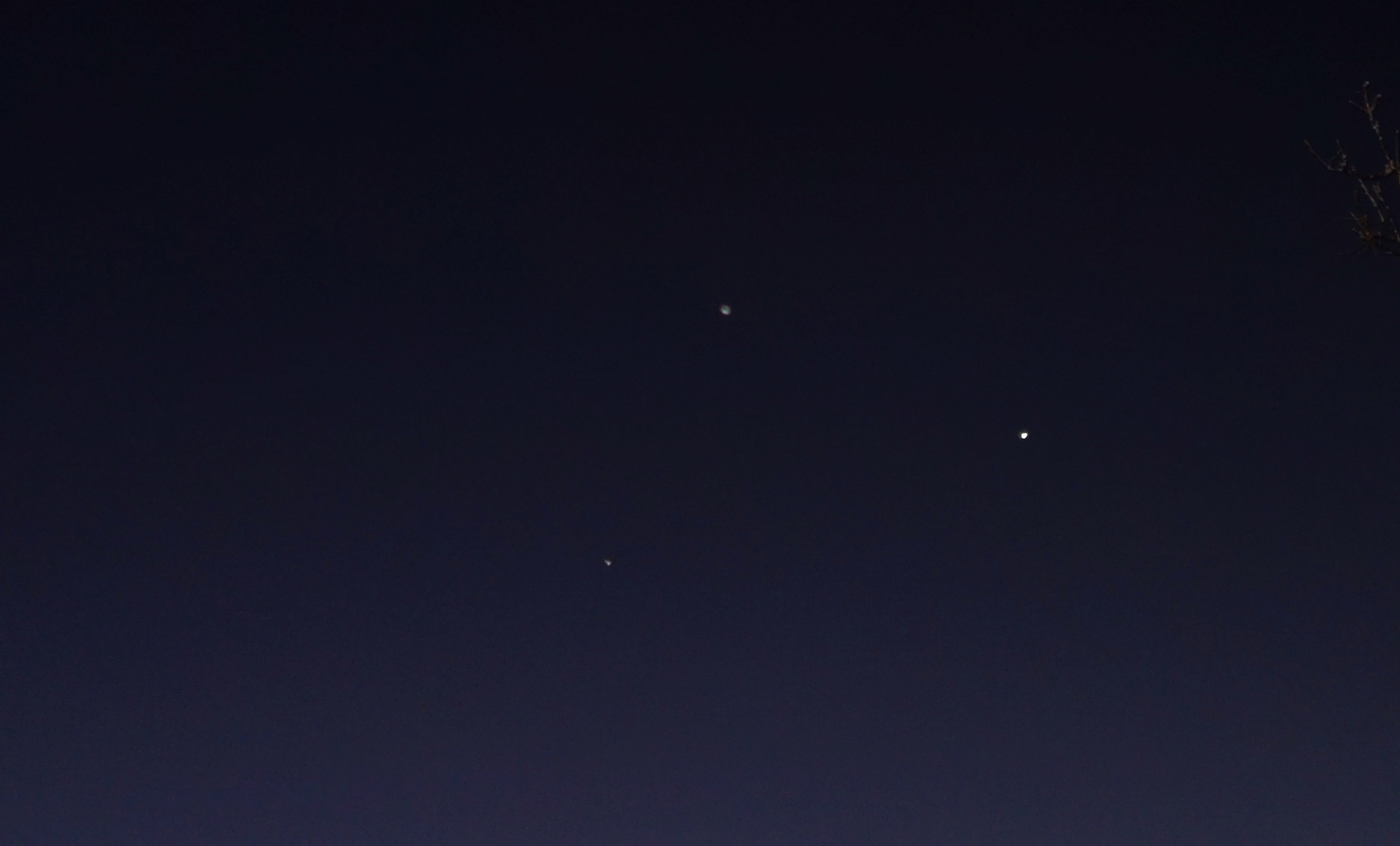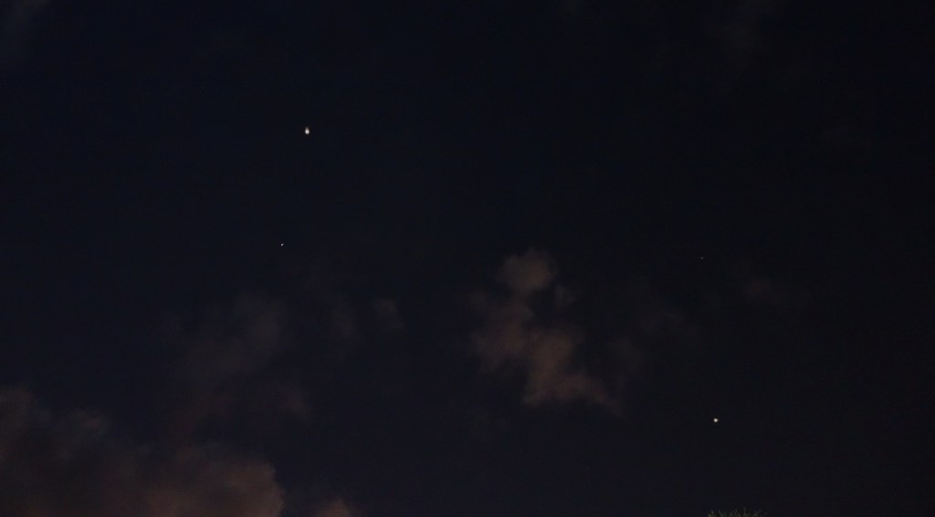Then all three appearing for a moment, still in straight alignment, below the Moon and Jupiter, in perfectly graduated sizes (showing the direction of the movement of the energies they were working with at that moment).