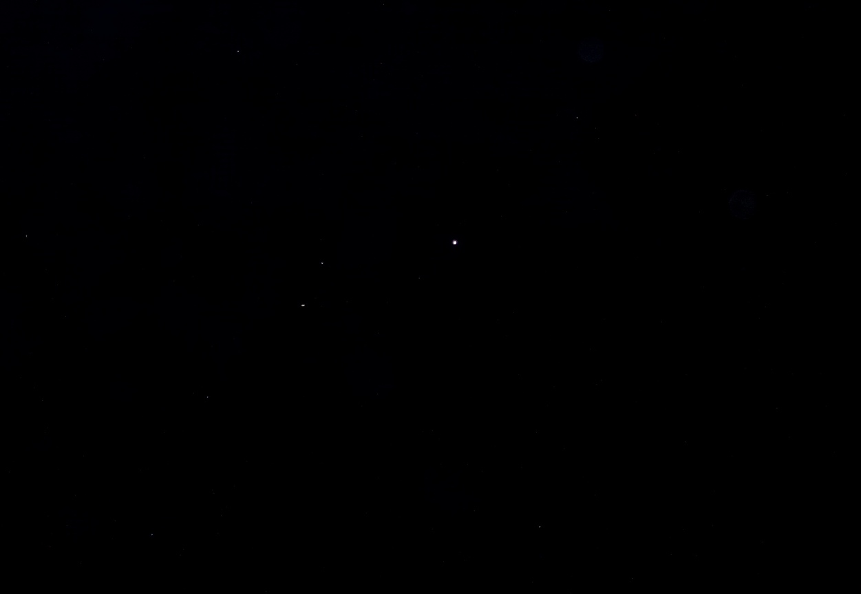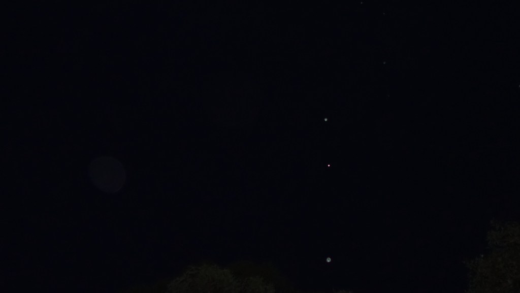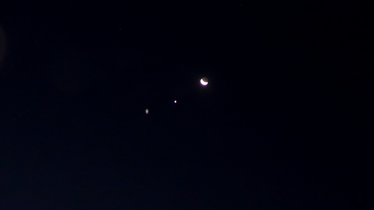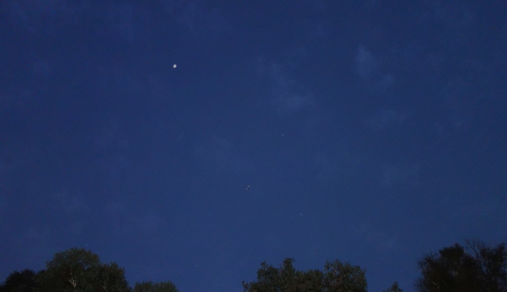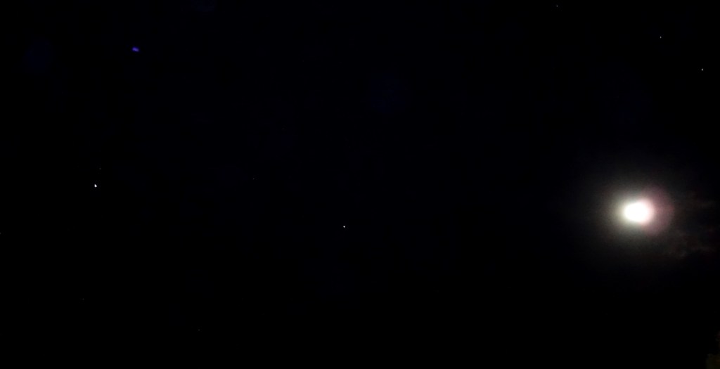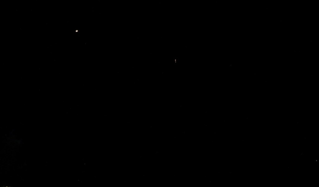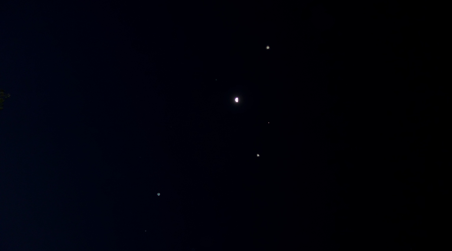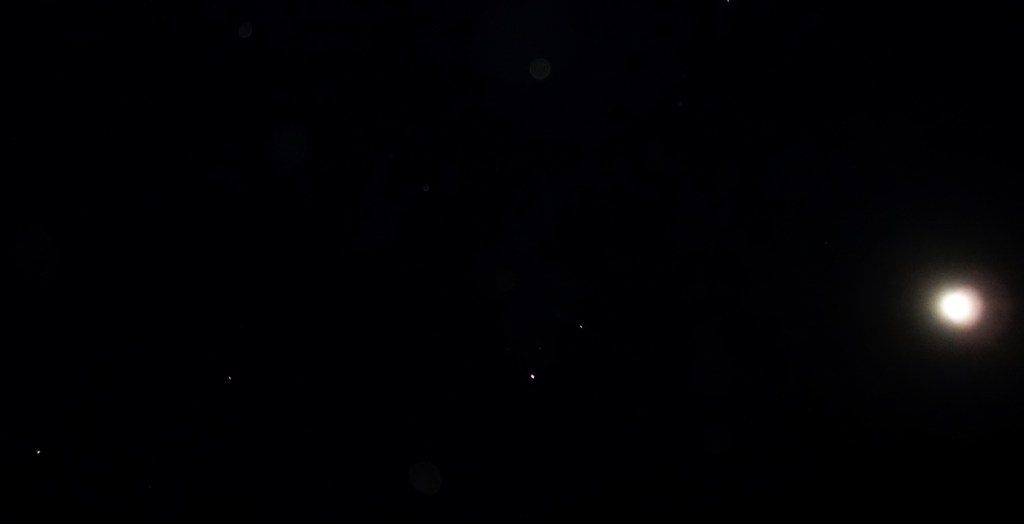 Then all three appearing for a moment, still in straight alignment, below the Moon and Jupiter, in perfectly graduated sizes (showing the direction of the movement of the energies they were working with at that moment).