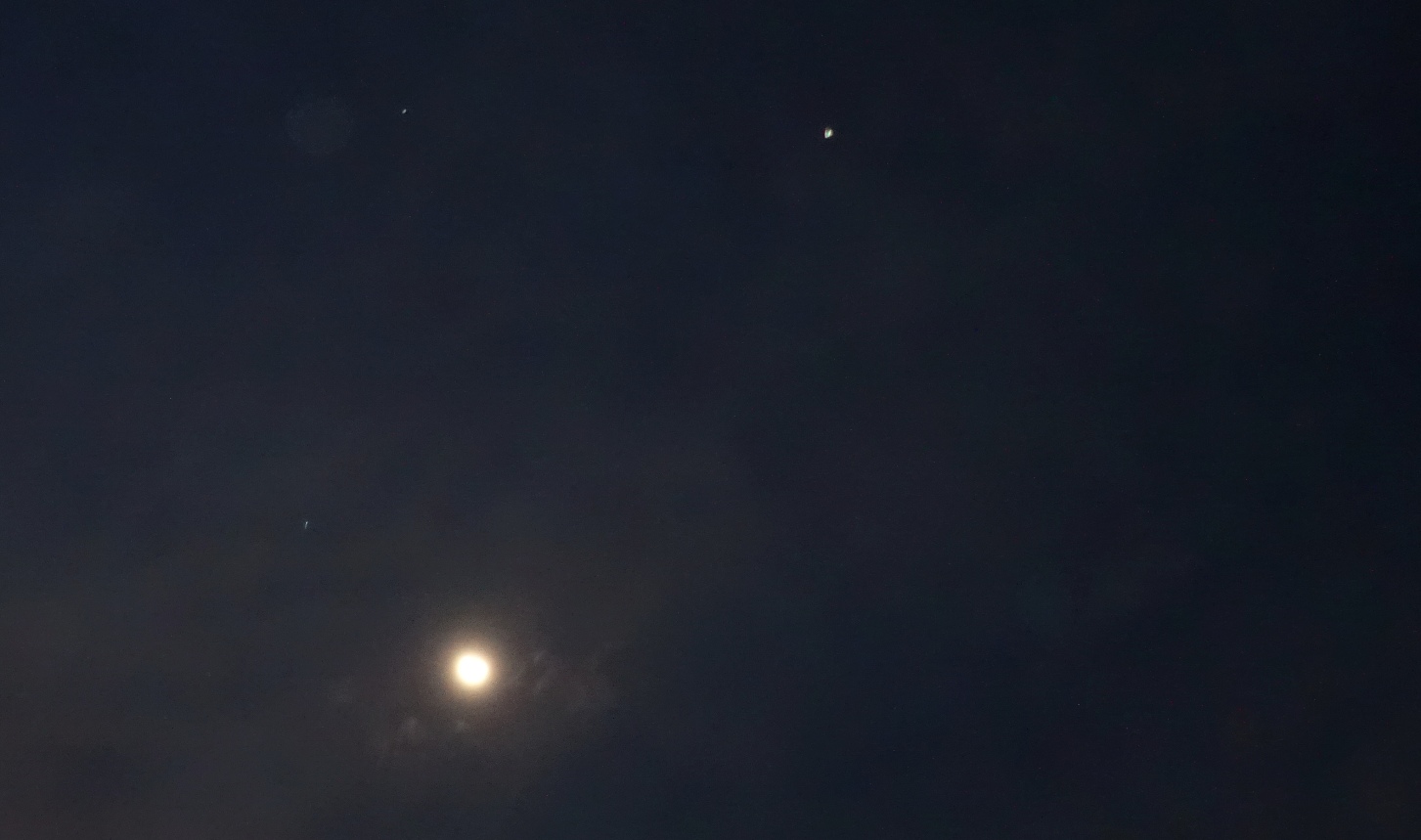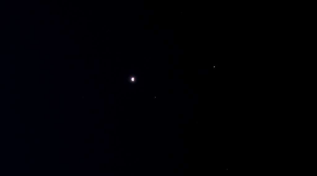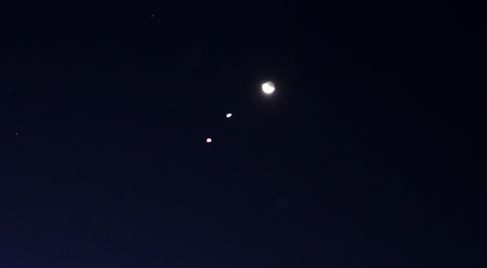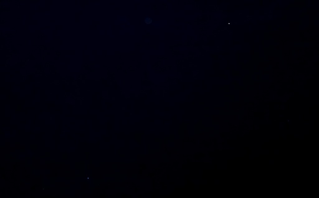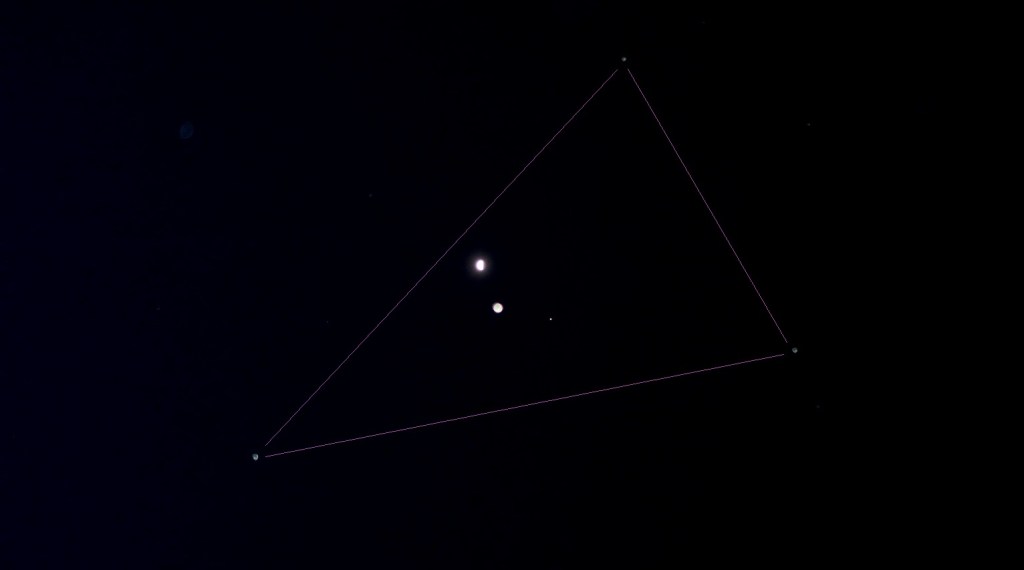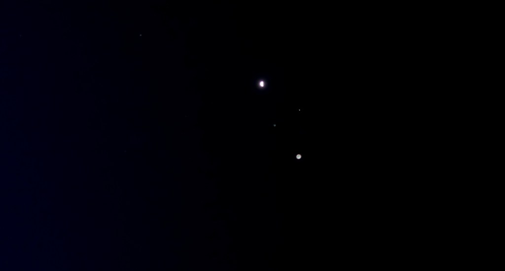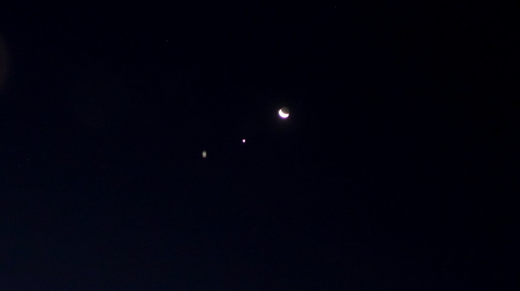 Then all three appearing for a moment, still in straight alignment, below the Moon and Jupiter, in perfectly graduated sizes (showing the direction of the movement of the energies they were working with at that moment).