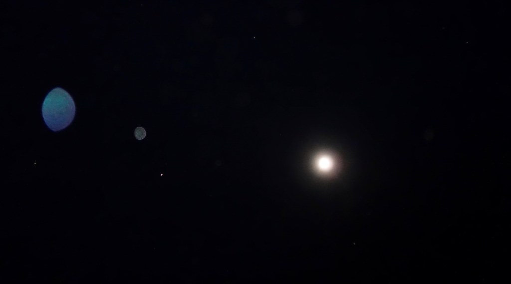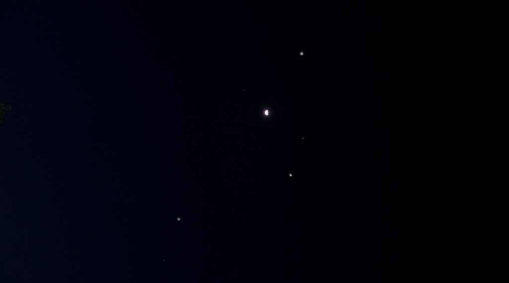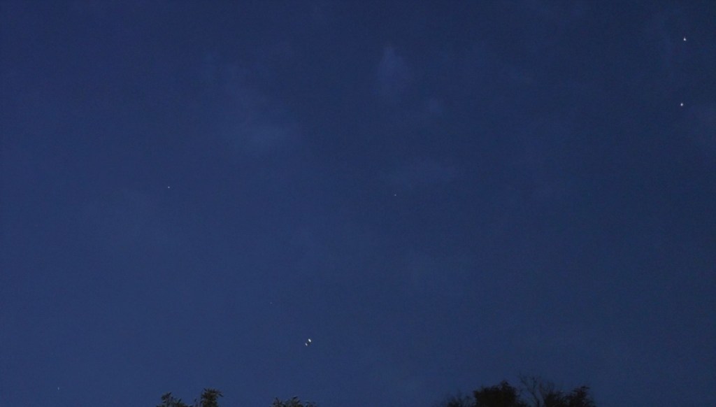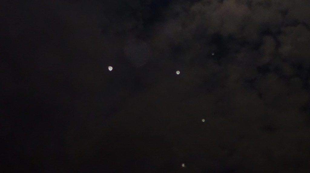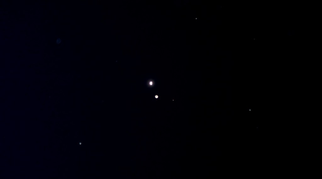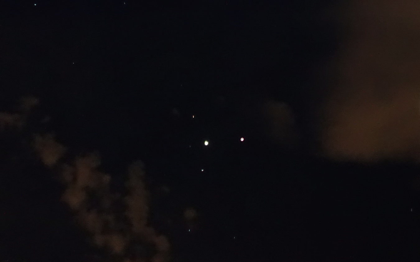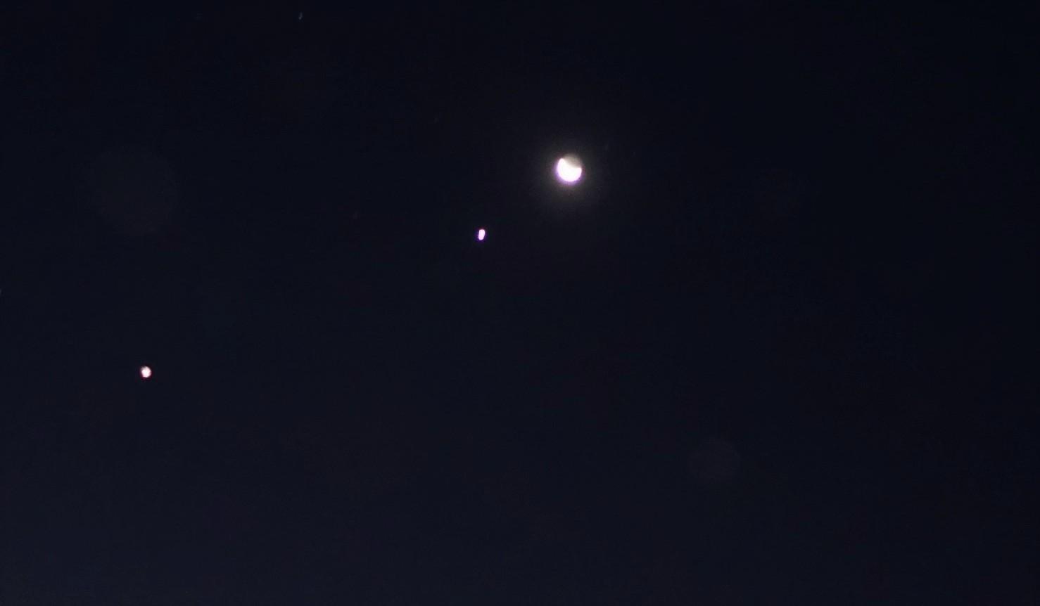 Then all three appearing for a moment, still in straight alignment, below the Moon and Jupiter, in perfectly graduated sizes (showing the direction of the movement of the energies they were working with at that moment).