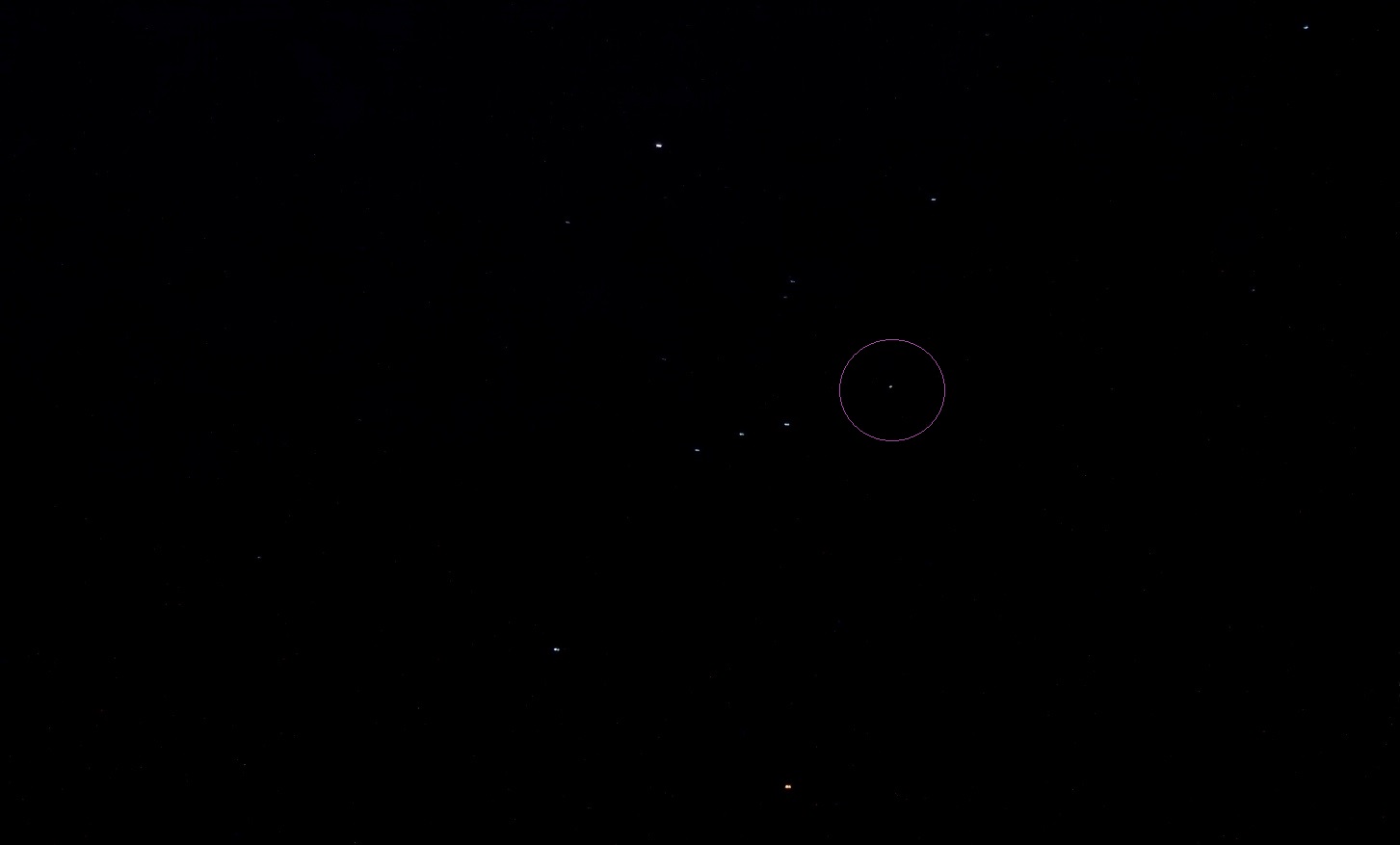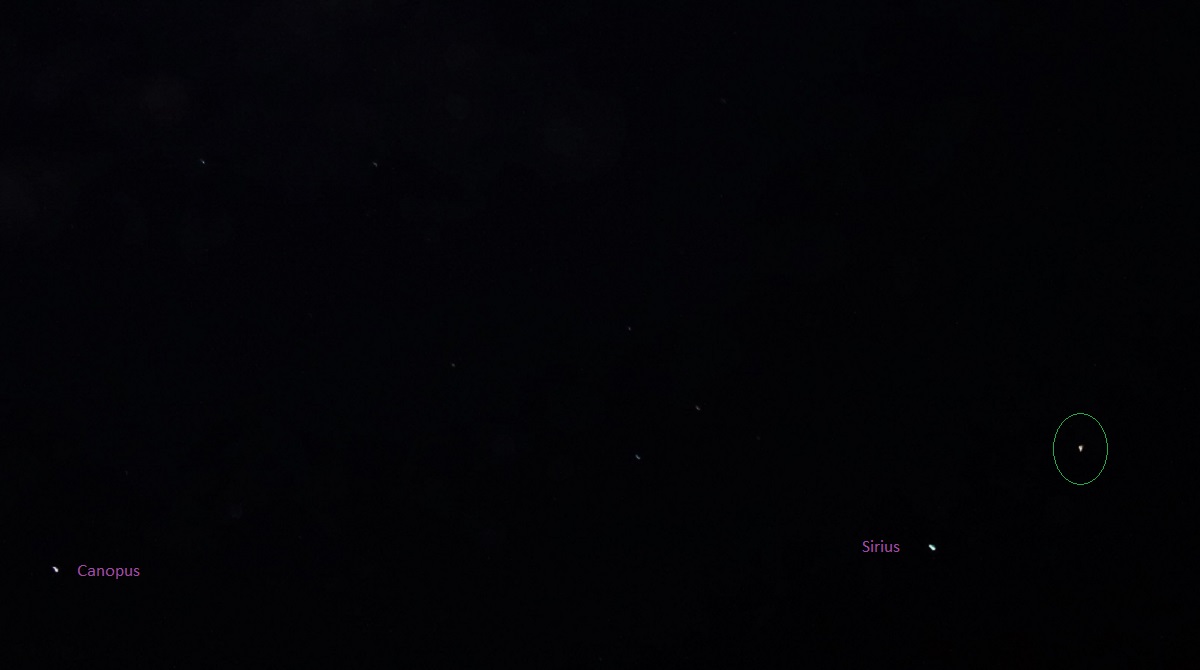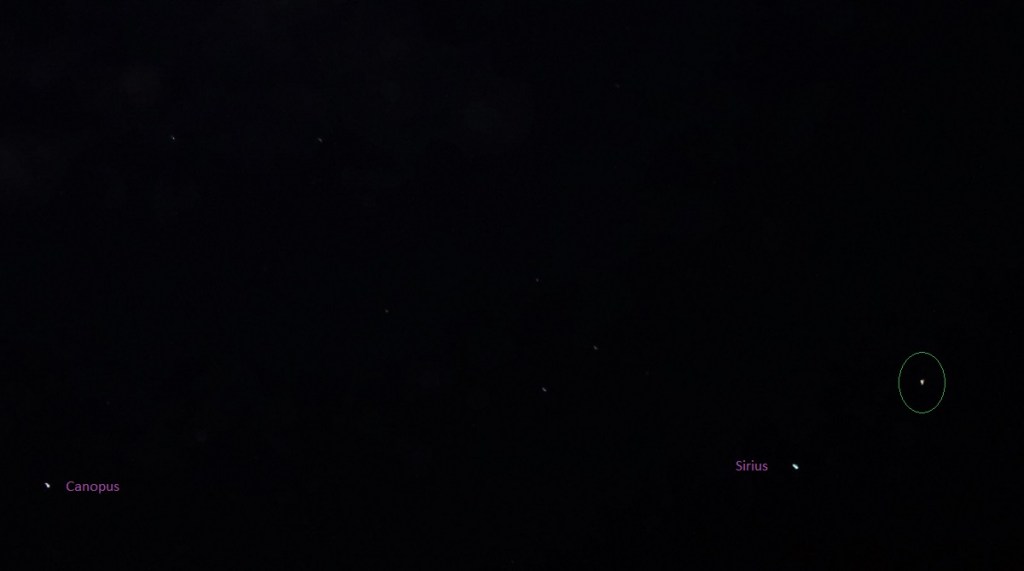 That night, three ships flew visibly across the eastern sky, two of them crossing over each other inbetween Sirius and Canopus. Here’s one of them, as it decloaked and passed by Canopus, with a large orb just visible, connected to the ship.