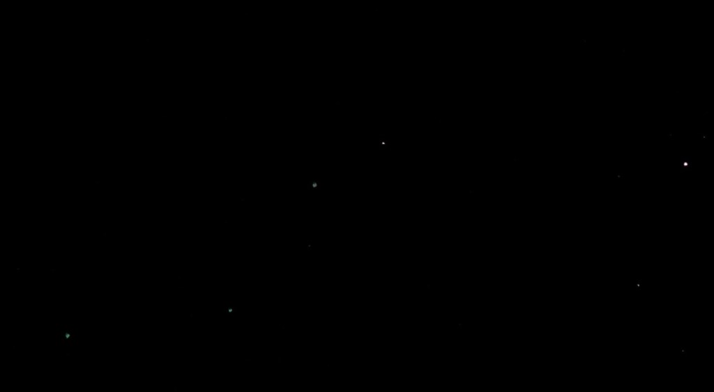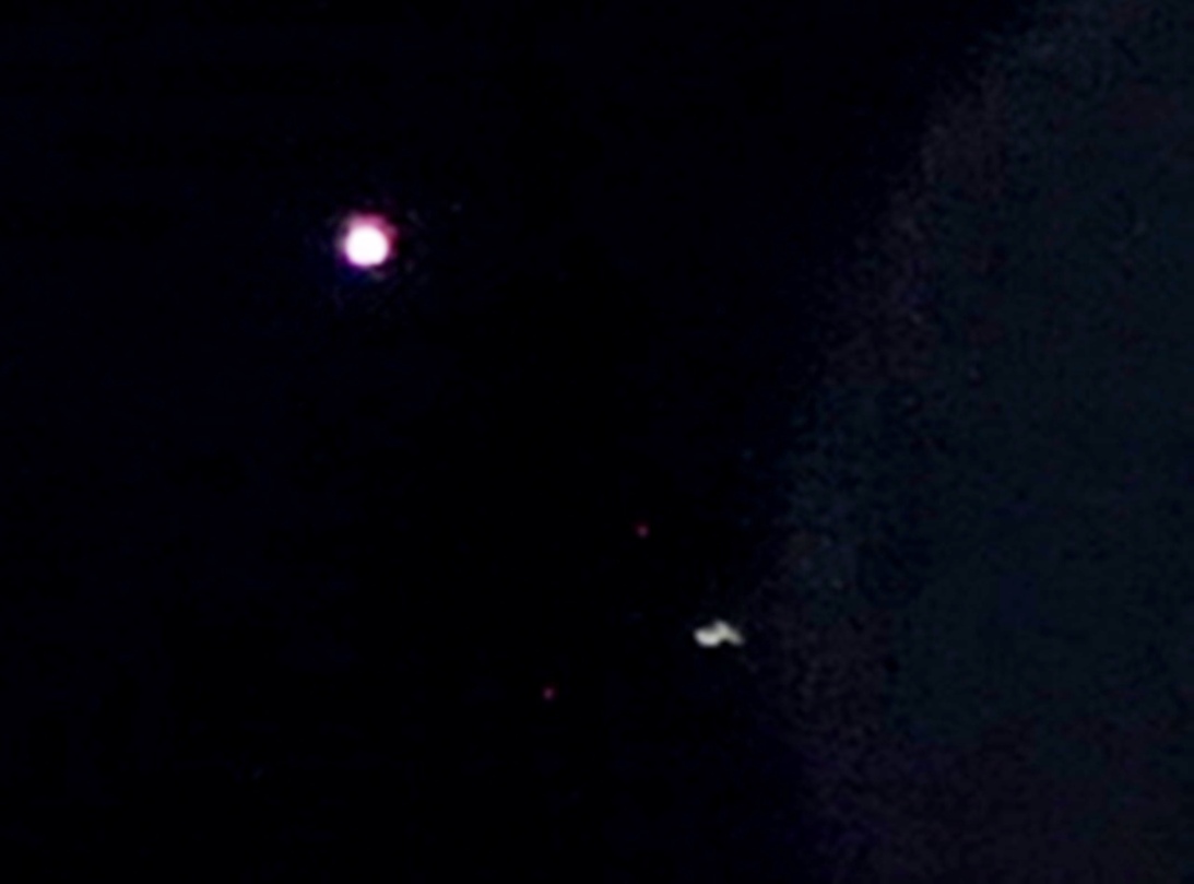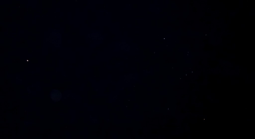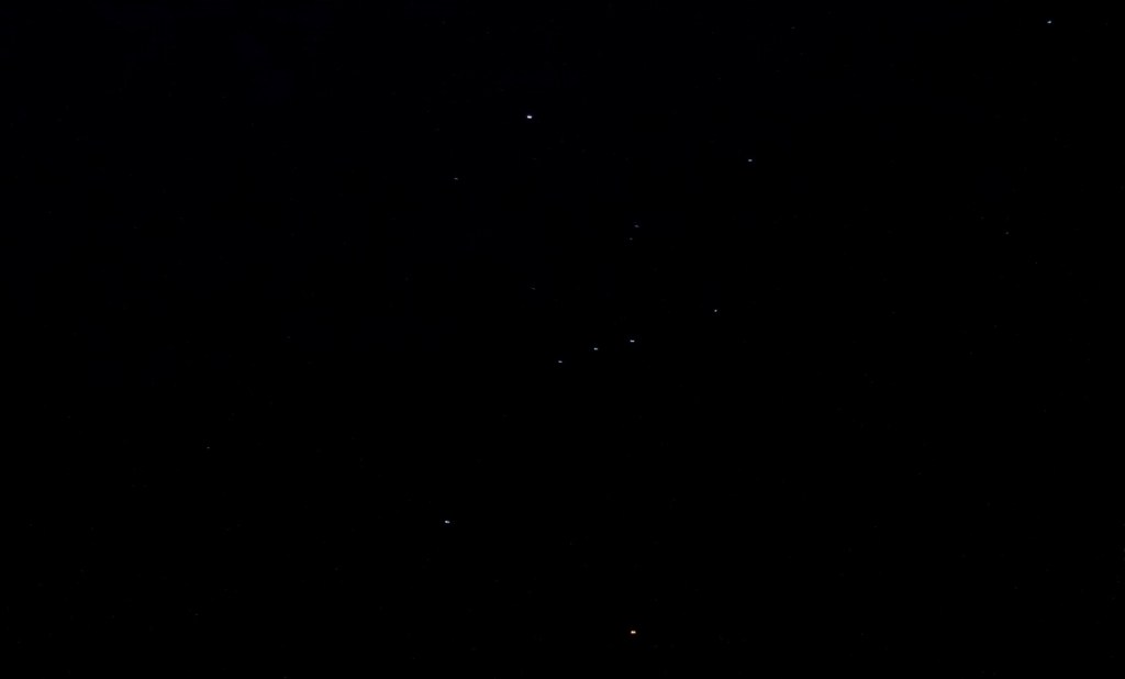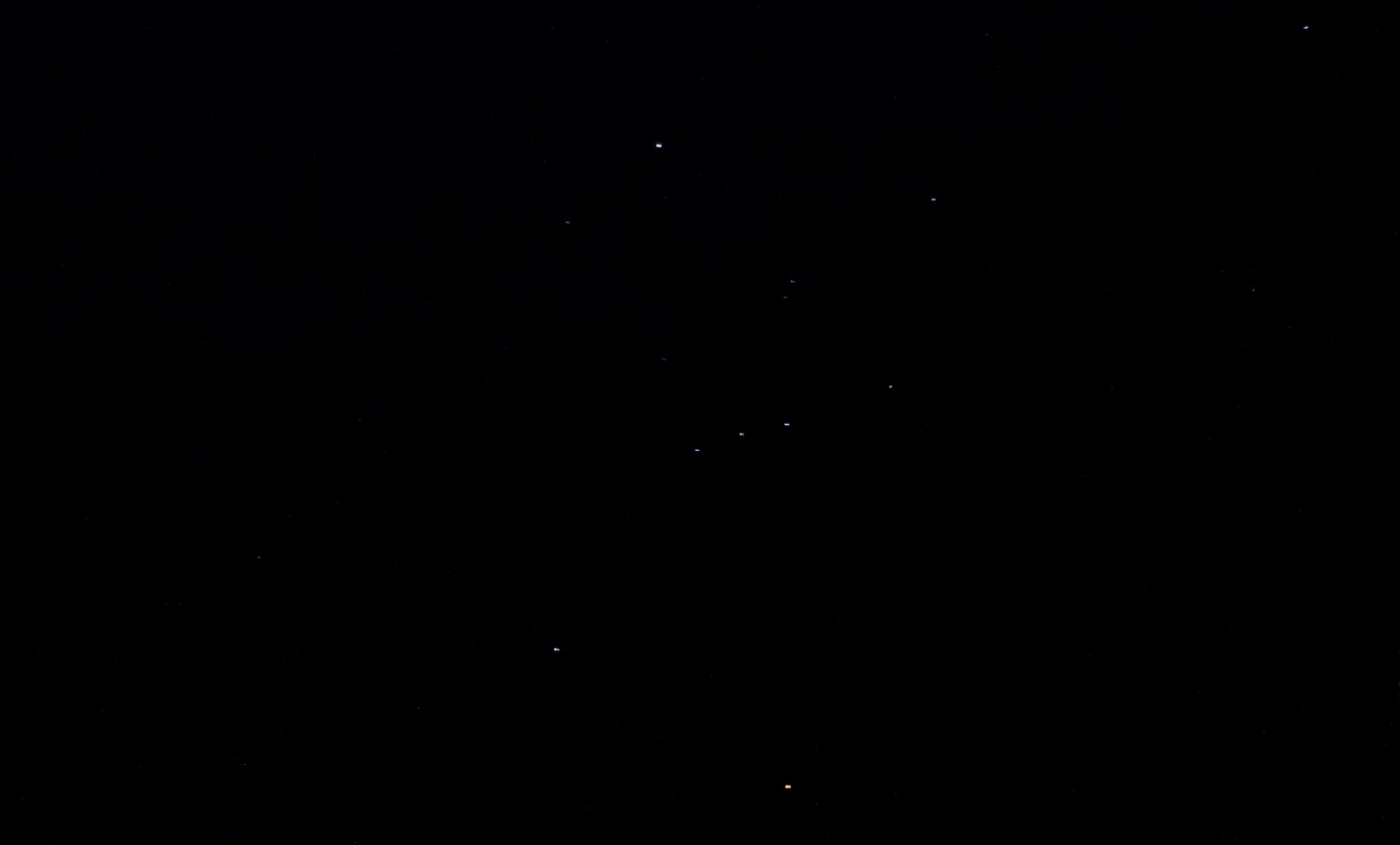 Lastly that night, a ship showed its presence near Aldebaran in the Taurus constellation. While Sirius turned rose-pink, Aldebaran looks like a red flame in this photo, with a white lightship flashign right below it, together looking like an exclamation mark, with the larger ship to the upper left. You can see the other fainter stars in this frame all looked ‘normal’; only Aldebaran became a streak (therefore not a hand movement of the camera, as all the stars would have ‘streaked’), so you can actually see a ‘light activation’ coming from the star that night!