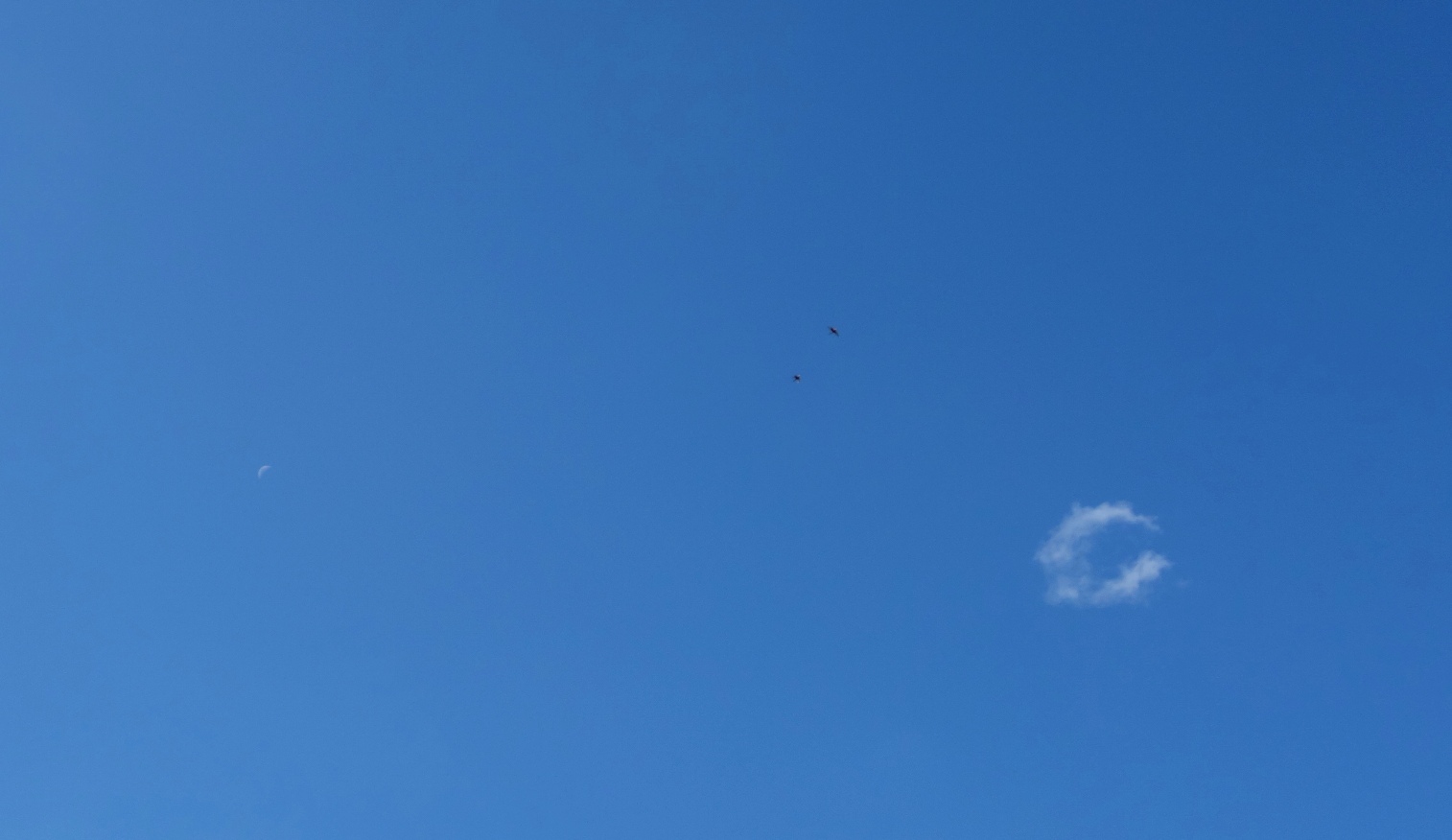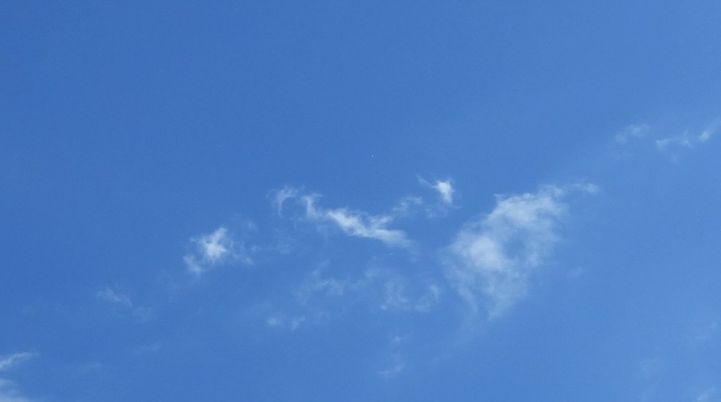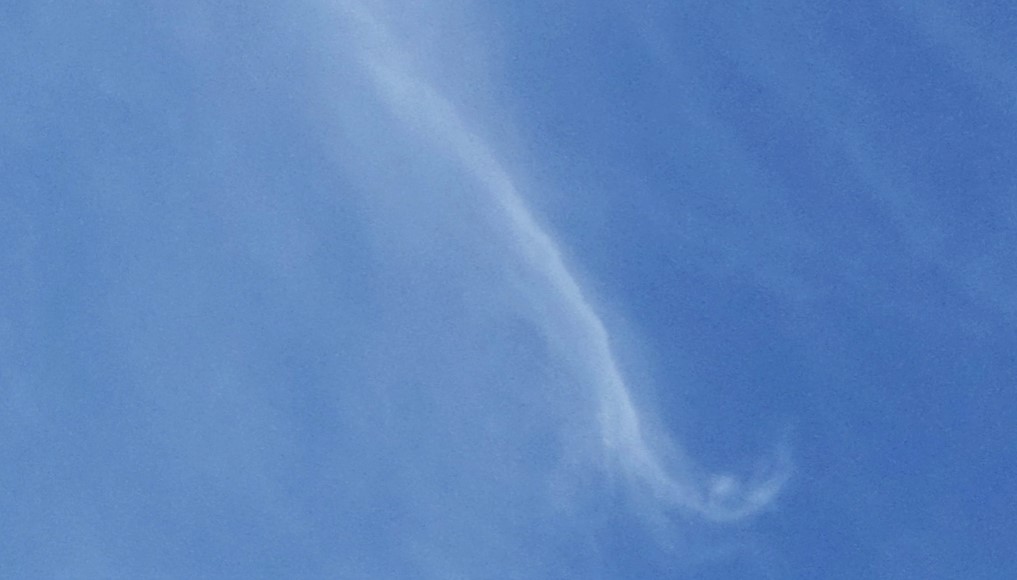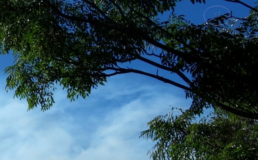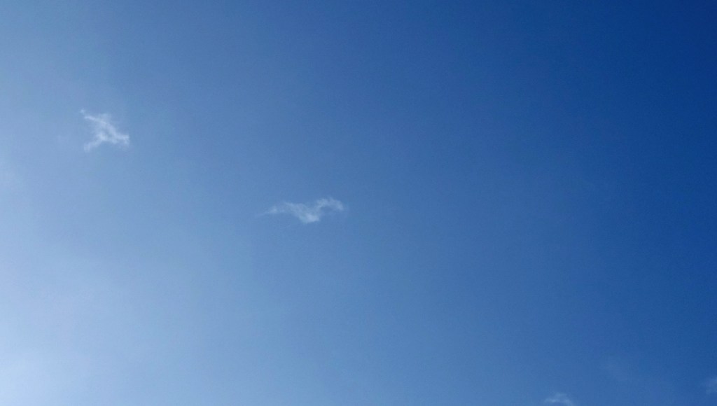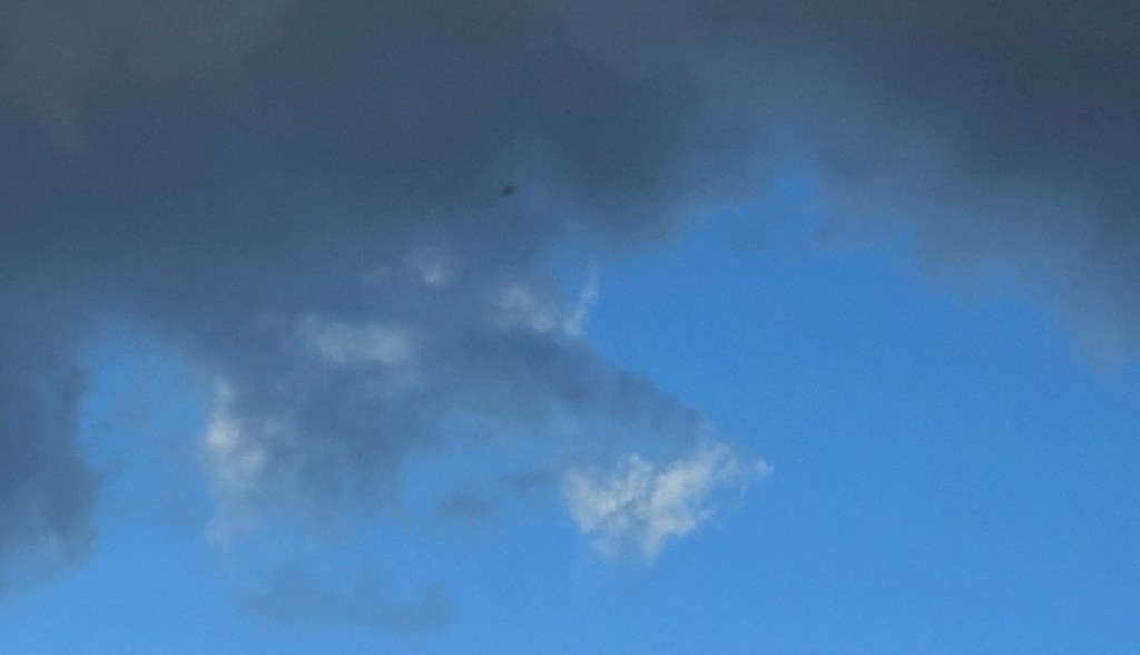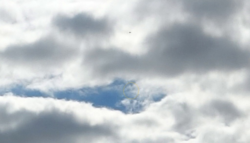 He then flew in front of a small, swirling cloud, which drifted out into several shapes. I’ve circled a bow-shaped ship outlined in the upper left cloud, and a beautiful loveheart than formed at lower right…which he then gave a bright flash above.