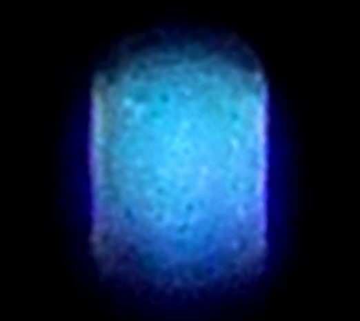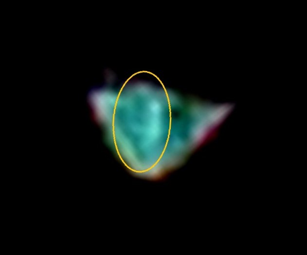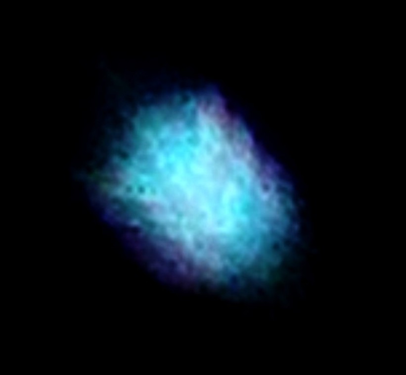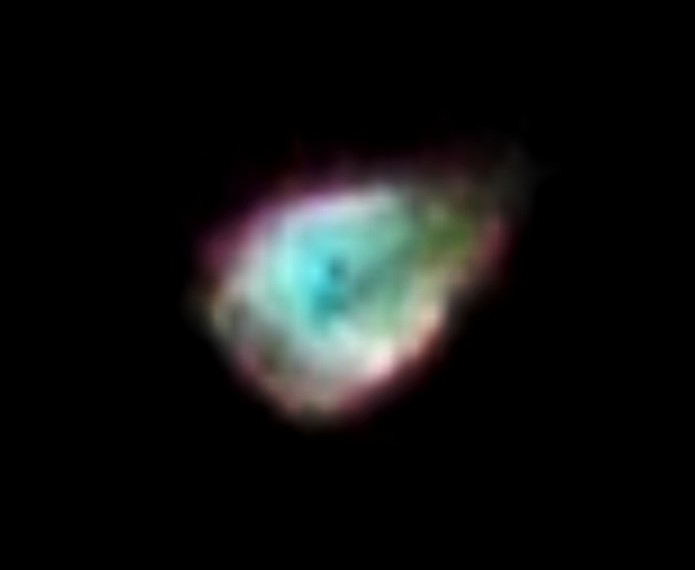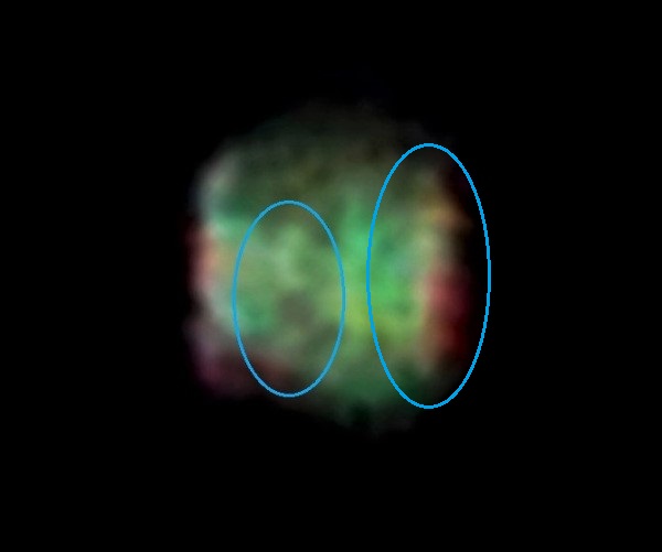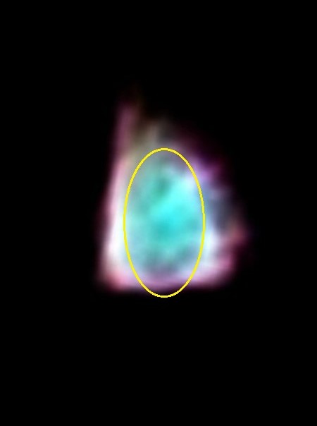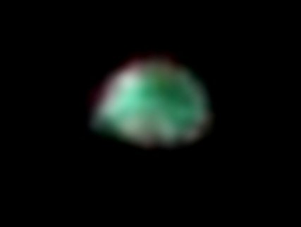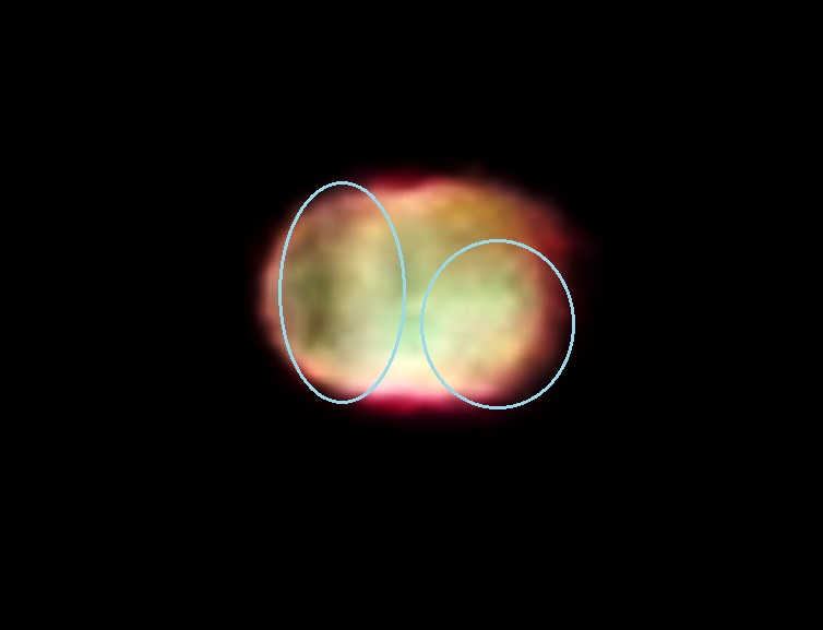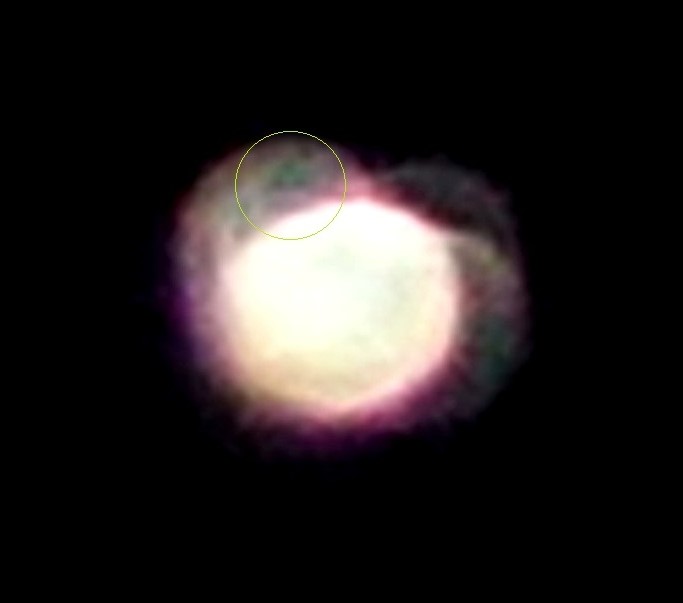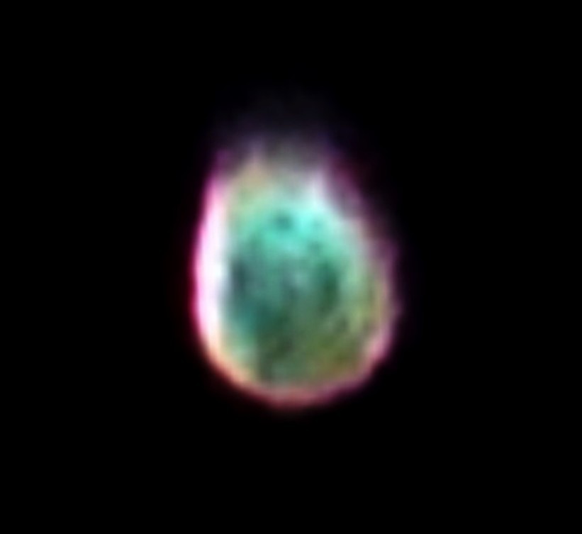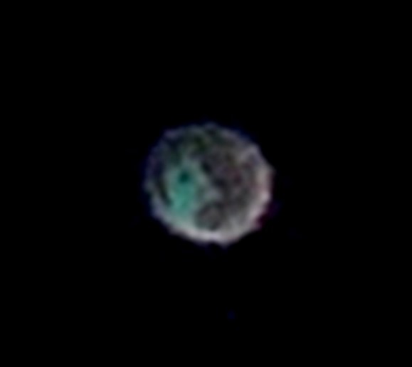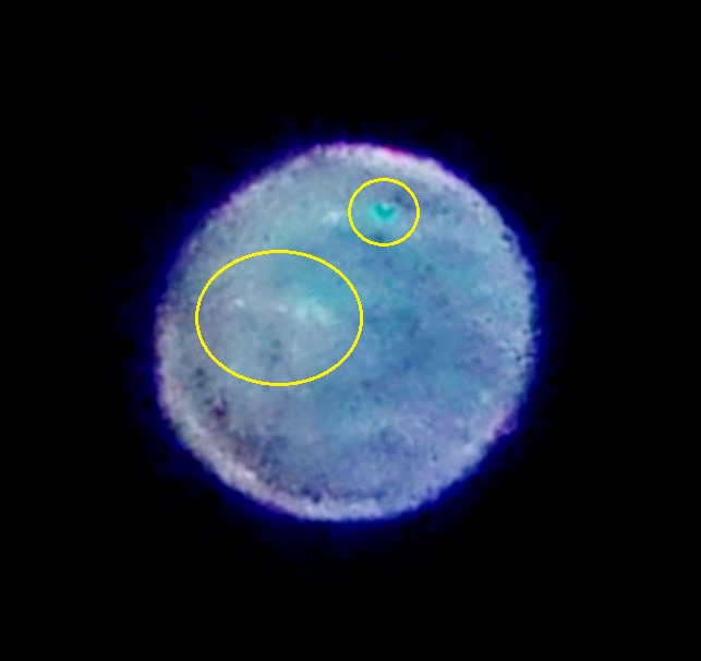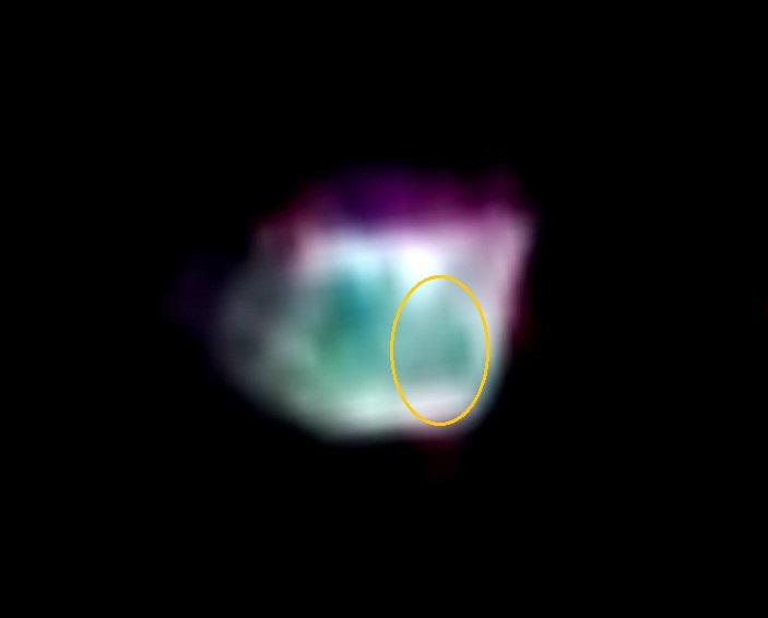 A few seconds after a ship flashed next to Alpha Centarui on July 7th, this magnificent orb of soft aqua-green and purple was visible in the photo below. Enlarged, a feminine form is subtly present, holding two spheres. Further enlarged, the sphere on her left shows a blue lion-like face, with a figure seated in profile at her lower right.