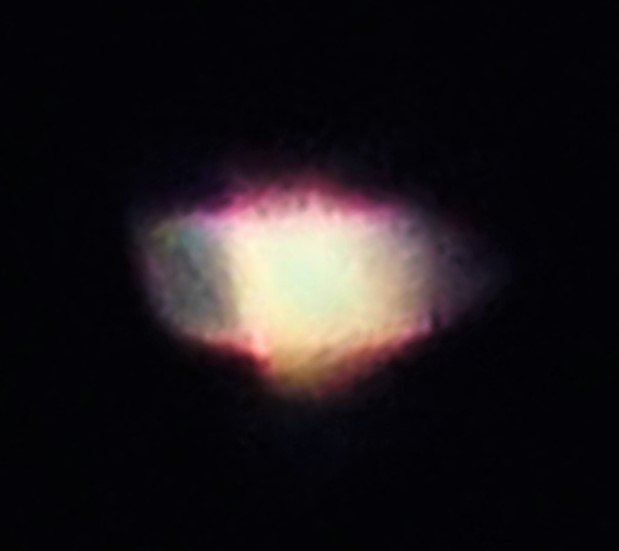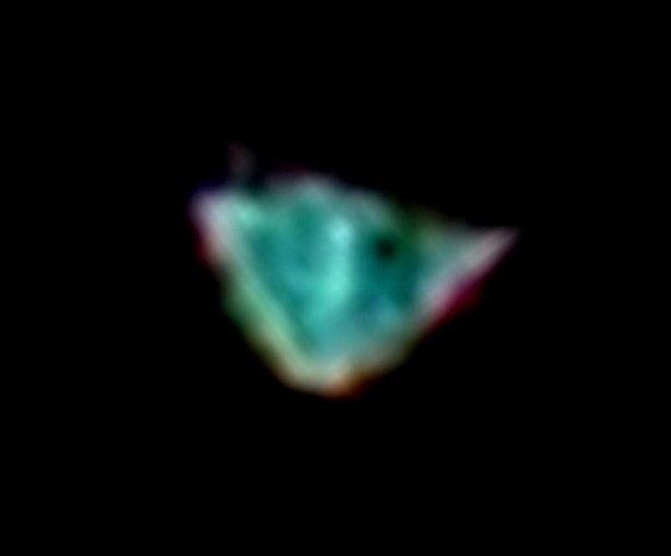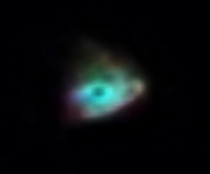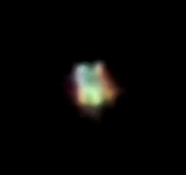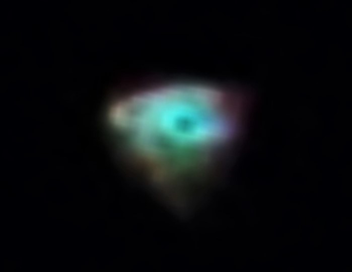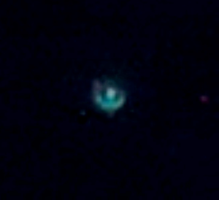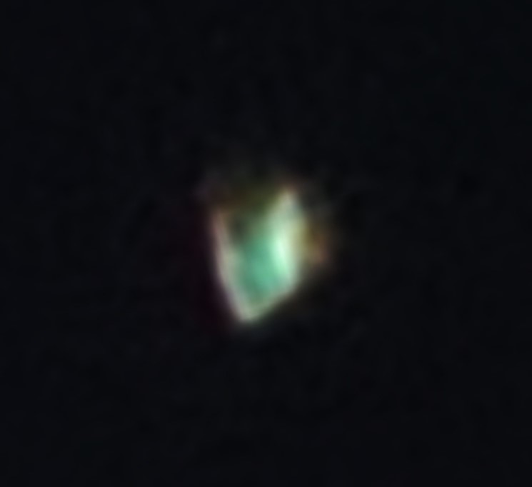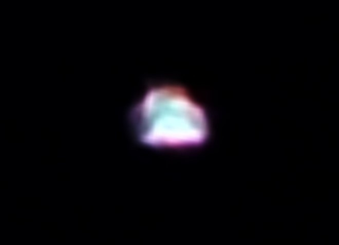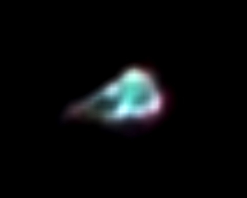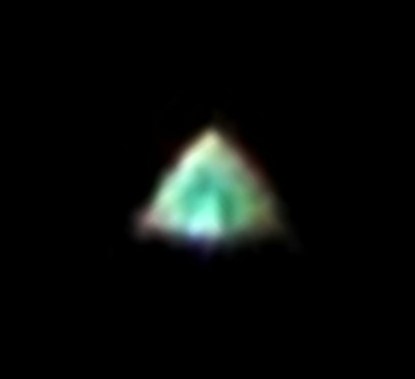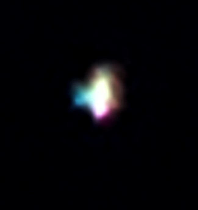 Close up, the ship is visible as three points of light, as a triangle shape, with the lower right light flaring in beautiful colours.