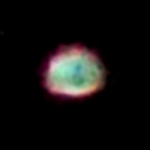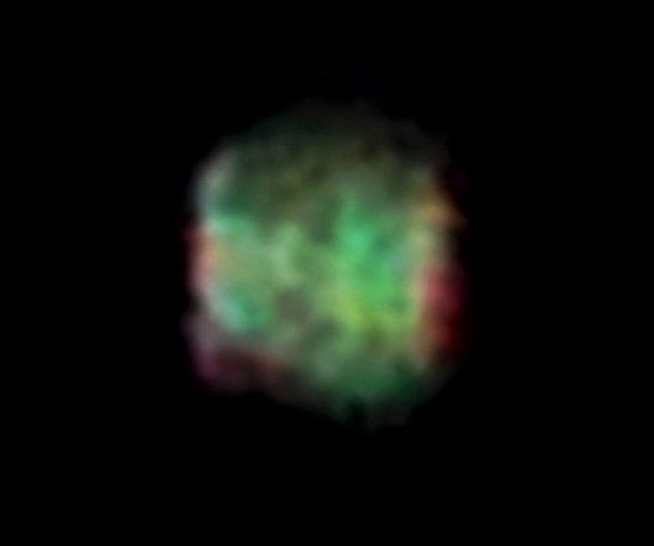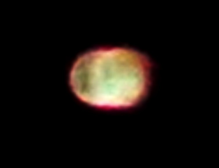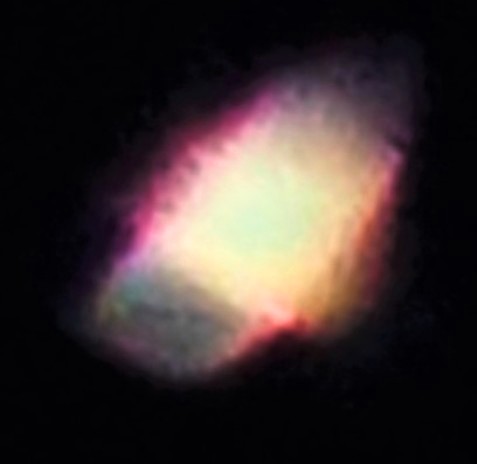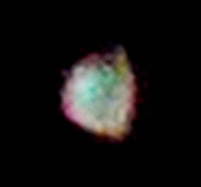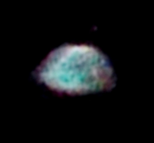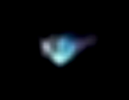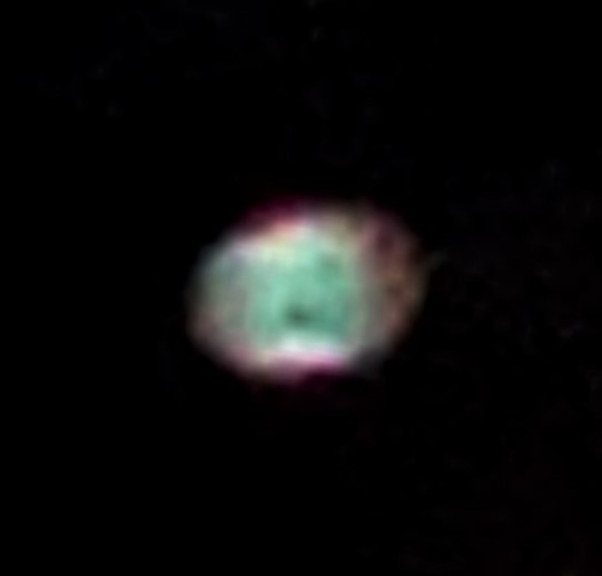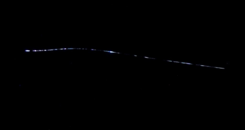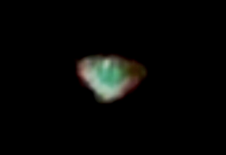 Close up, the ship is visible as three points of light, as a triangle shape, with the lower right light flaring in beautiful colours.