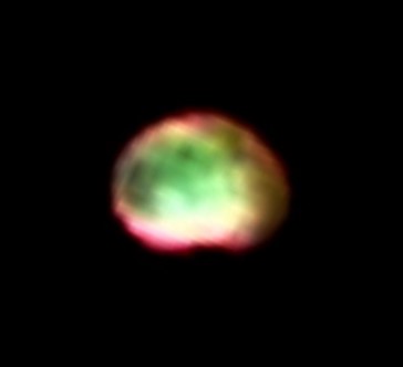 As the Lei’hua tracked higher, flying here high above Jupiter, Ashura (in his 5D form Arnap) sent this glowing emanation, at the moment he was getting up from a chair. Its shape is clearly defined in iridescent lime green and blue, and he can be seen in a dark green outfit, levering himself up from a sitting position (Jupiter is the bright light near the lower edge of the frame, with the emanation of Arnap upper right of frame).