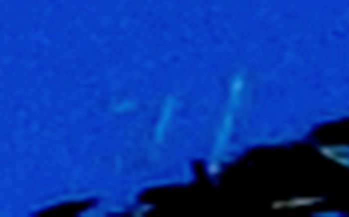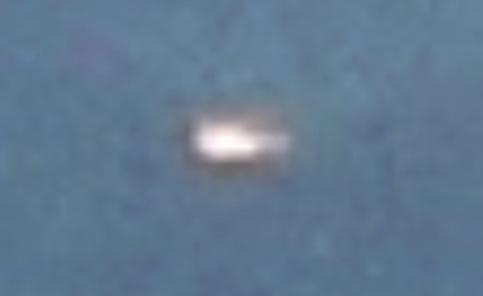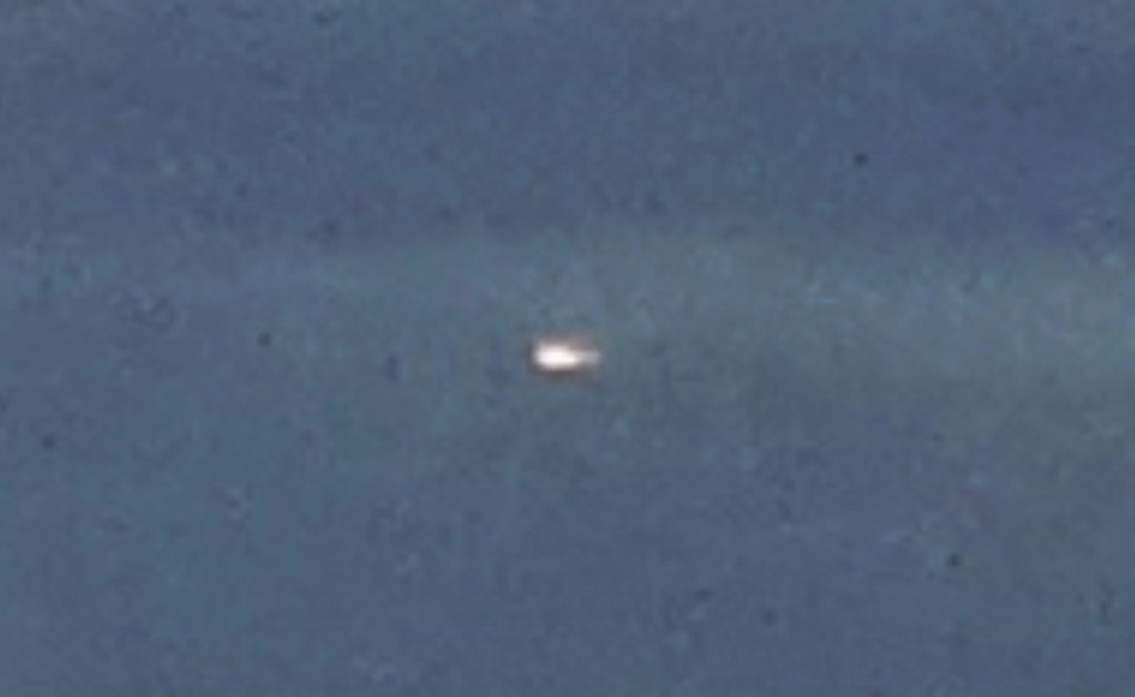 On July 29th, a ship showed up in a photo for a second time this year in an almost identical format. On March 19th, it gave a very clear triangular outline with a glowing white pod-ship attached beneath it. In the July photo, you can see what is clearly the same ship, or same type of ship, this time without the pod, but with two small bright lights at the pod ‘attachment points’ (with the photo from March 19th on the right for comparison).