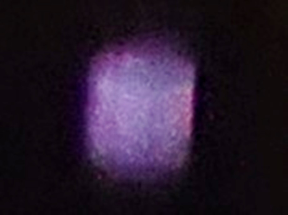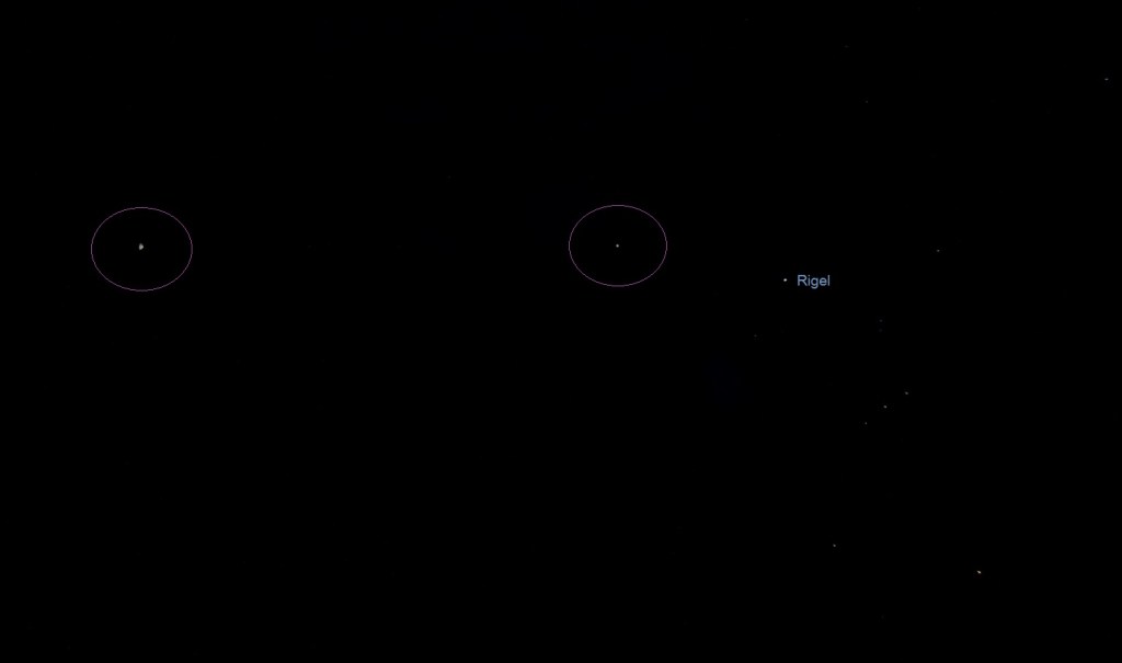 Following the Shem’Arua’s visible flight, two ships flashed for a moment in a straight alignment, to the left of the star Rigel in Orion. Star family continue to keep a close watch on (lower astral/lower 4D) portals around Rigel and some of Orion’s other stars whose vibration is variable at present. The enlargement below, of the brighter ship at the left, shows several standing figures, facing forward, with a white light behind them.