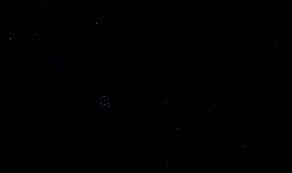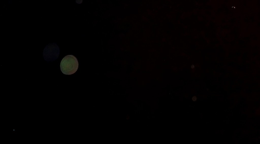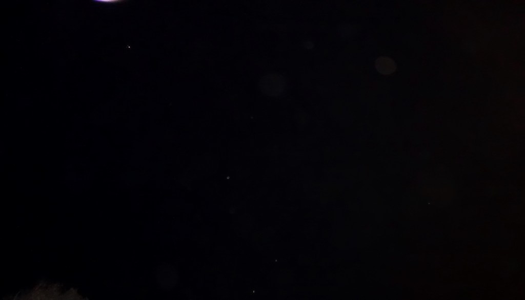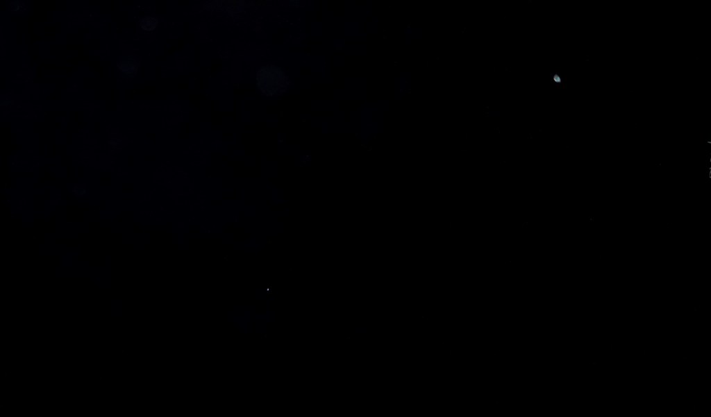 Still centered around these two stars, two ships flashed close to each other, while a related orb flashed to the right of Alpha and Beta Centauri (Alpha Centauri’s at the lower edge of the frame, with Beta Centauri obscured by haze above it, with the ships at upper left).