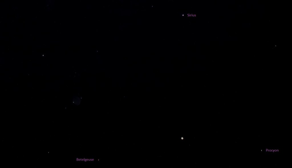 The next night, on January 18th, a ship decloaked for 10 seconds or so, flying past Alnitak the ‘other side’ of Orion’s Belt down toward the star Procyon (not in the frame).