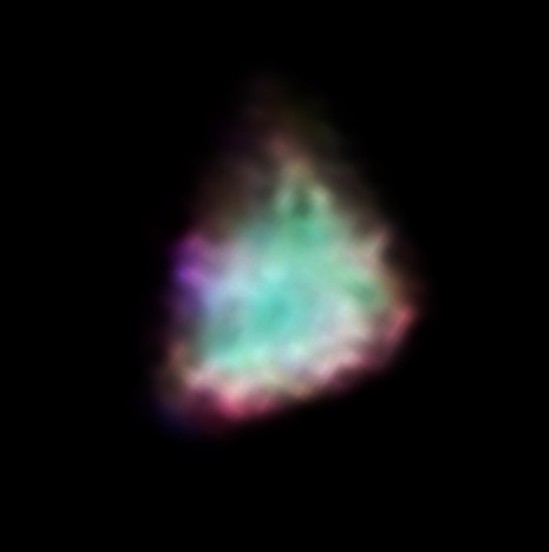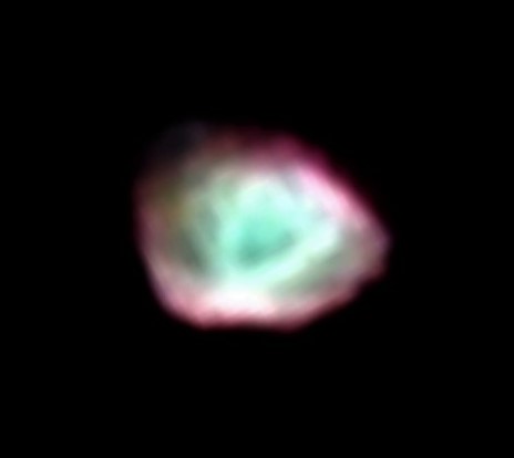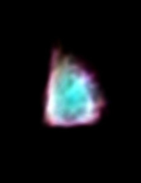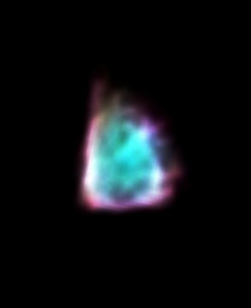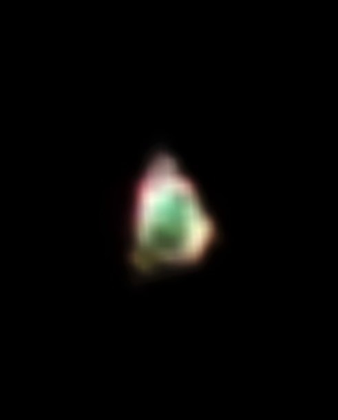 Followed by a larger orb of merged red and green tones…with a tiny bright flash of green from a ship at lower left of the orb, and a much larger flash from a ship to the upper right, showing a wide triangular formation, with one red ‘wing’ and one green ‘wing’ (ie; two wings of the same fleet, merged soul groups and energies from planets of those two stars).