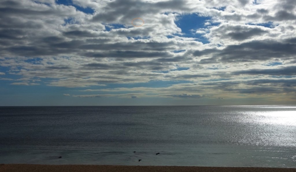 On April 9th, while light was being sent from the motherships through the 33rd Parallel South (the 33rd parallels are vibrationally connected with the planetary merkaba/light-body), Arnap hovered a pod-ship over the ocean (at Bunbury, Western Australia). His ship wasn’t visible but I heard/felt to point the camera above a flock of five pigeons, and in its cloaked form, the pod-ship appeared in two photos, directly above the birds (and circled below).