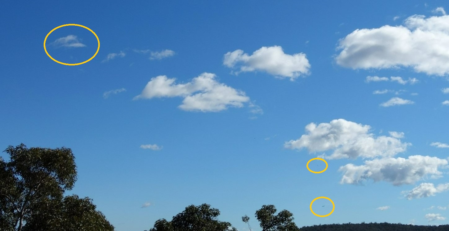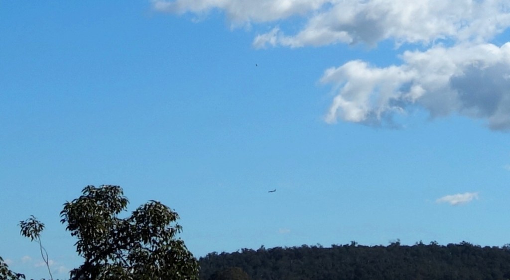 On September 9th, a pair of lightships skimmed along behind a plane flying from the city of Perth eastward over the hills. In the first two photos, the plane appears as twin lights low over the trees, with firstly one ship flashing from almost above it. The two ships then can be seen at the far right of the frame, having flown ahead of the plane, above its flight path. They then hovered lower and brighter after the plane had passed, for a few seconds before winking out. Openly sayng, “We’re here.”