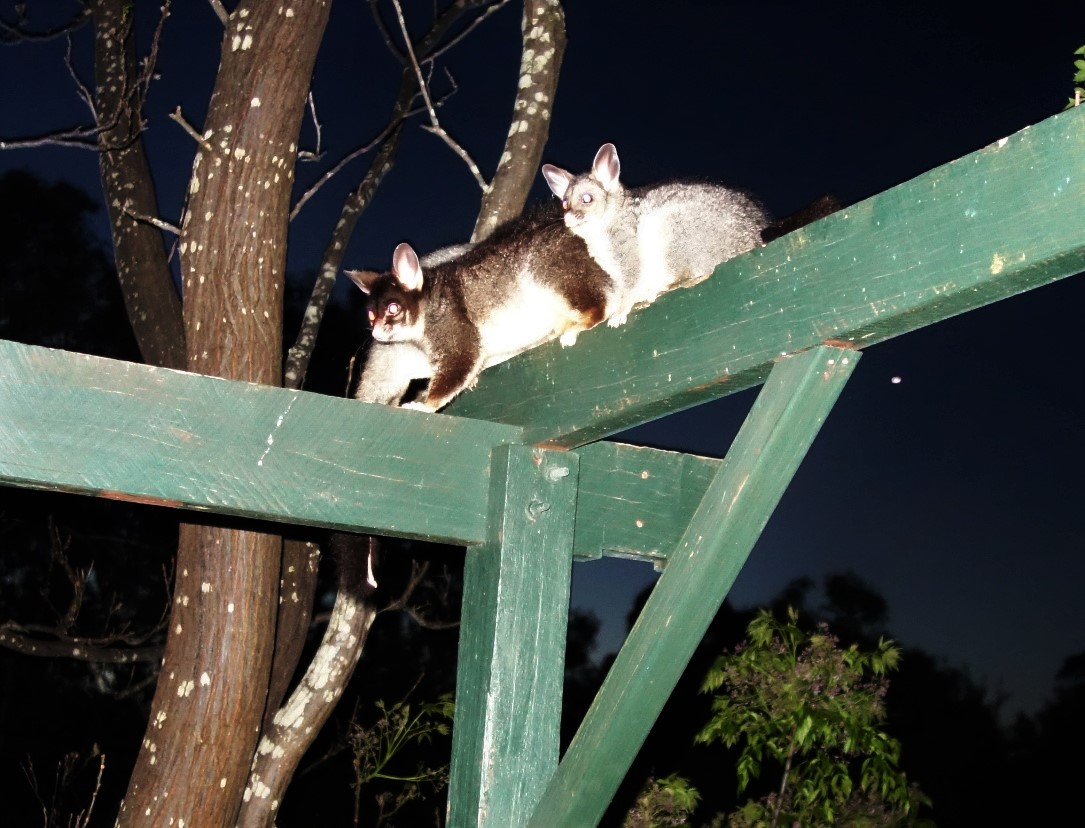 The next night October 5th was pretty hilarious, as I was focusing on taking a photo of two of my gorgeous resident possums without flashing the camera straight into their eyes, and didn’t notice the lightship low down, behind them, until I’d taken the photo below, then saw a brief twinkle beyond the trees. on downloading the photo, it showed up quite well (lower right of the pergola)! ๐