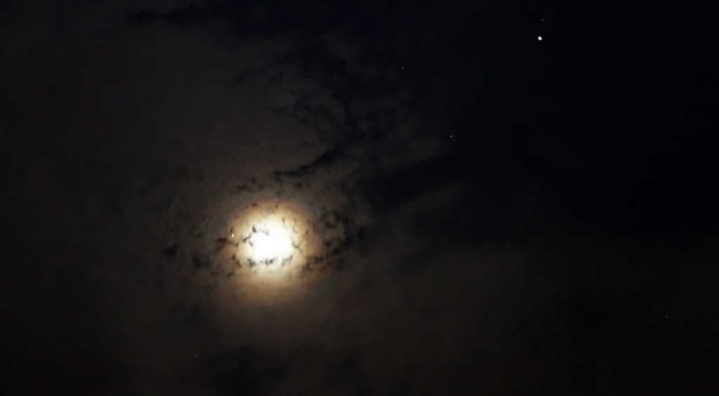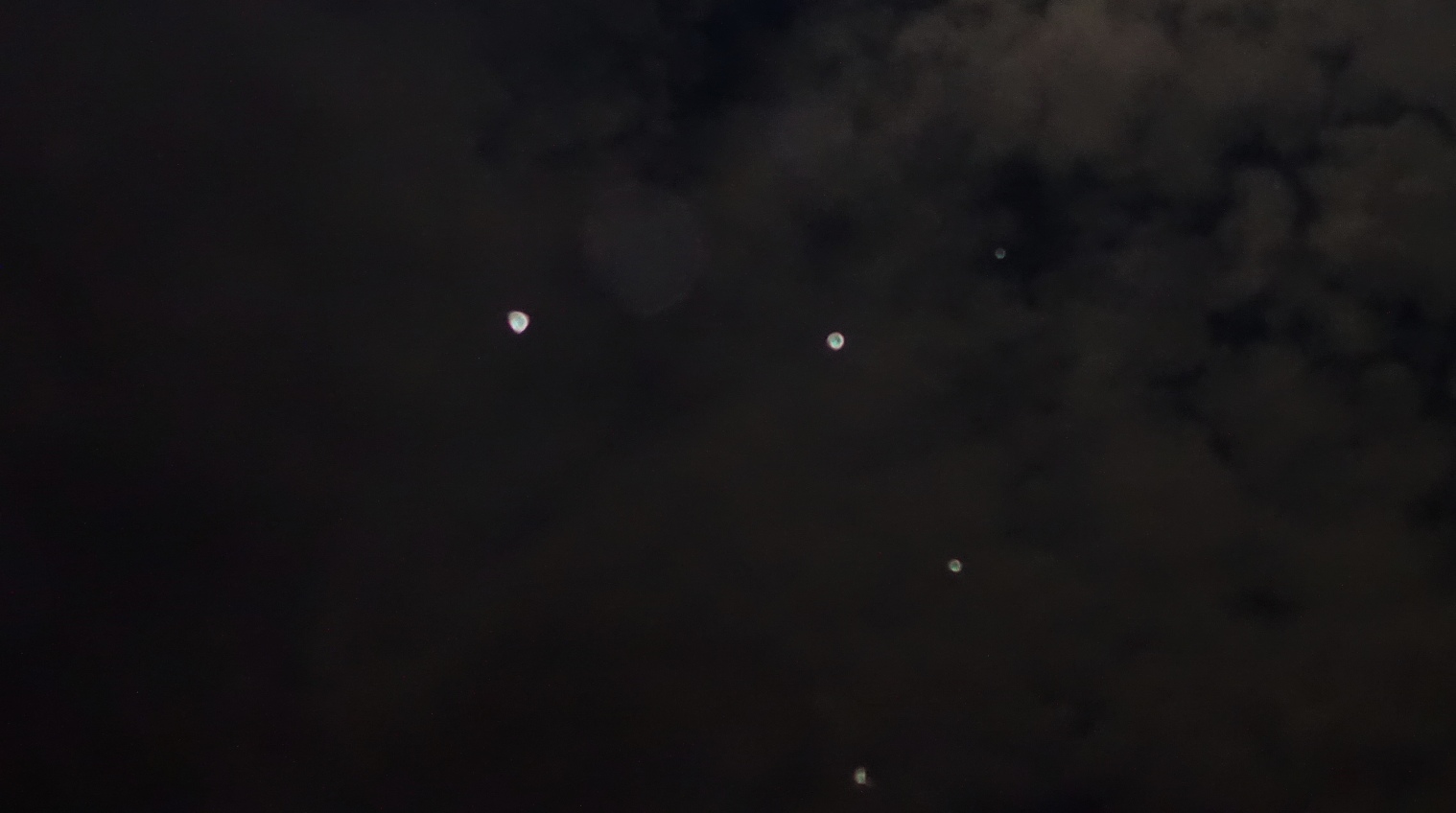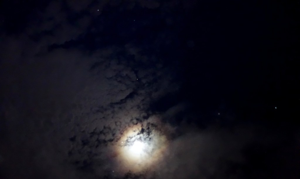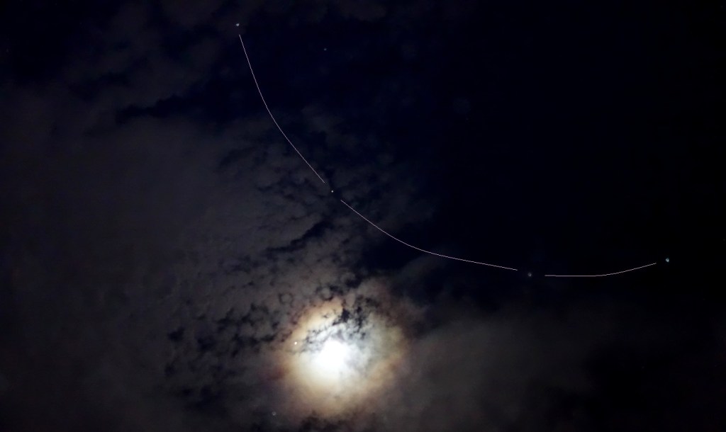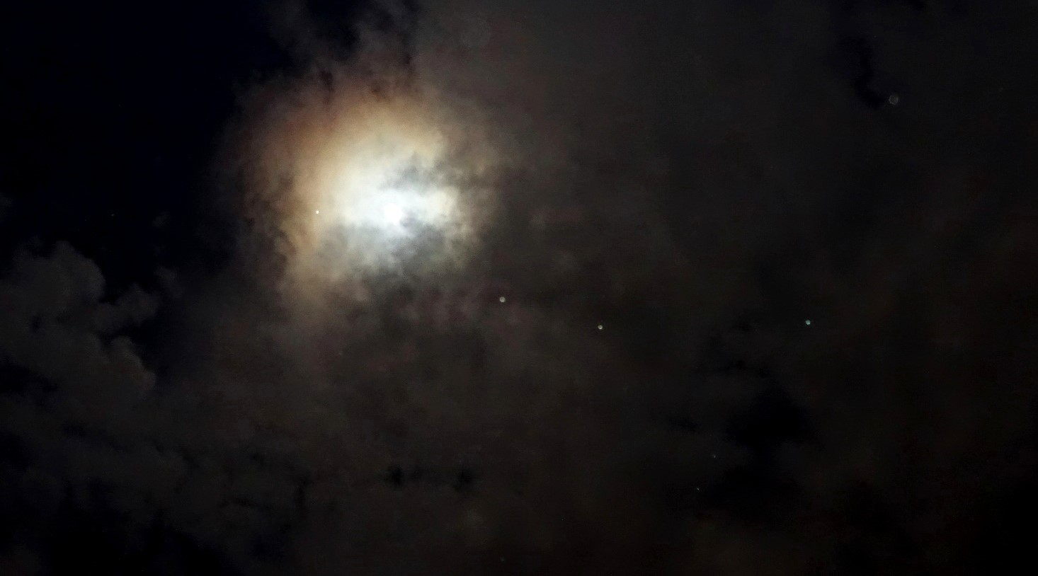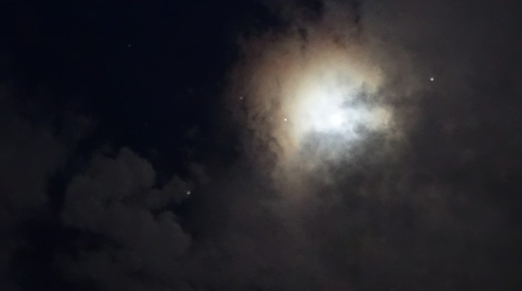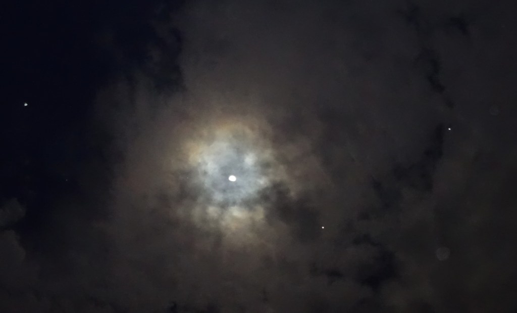 The four then flipped up above the Moon, in a mirror formation of the light halo around the Moon, which had also morphed from round to softly triangular in the clouds.