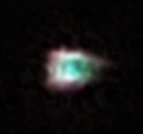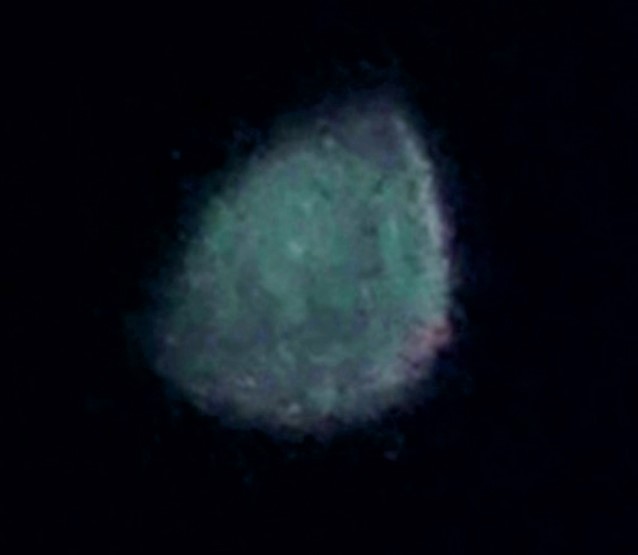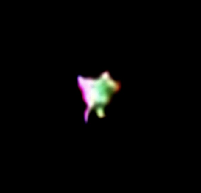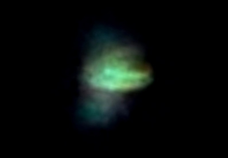 Finally, this bright green flash came from the right of the Moon and Jupiter, and enlarged reveals a being laying on a green-gold light disc and bathed in green light, receiving a healing (green is the colour frequency of healing and refreshment of energies). A being behind the disc is just discernible, guiding the healing light.