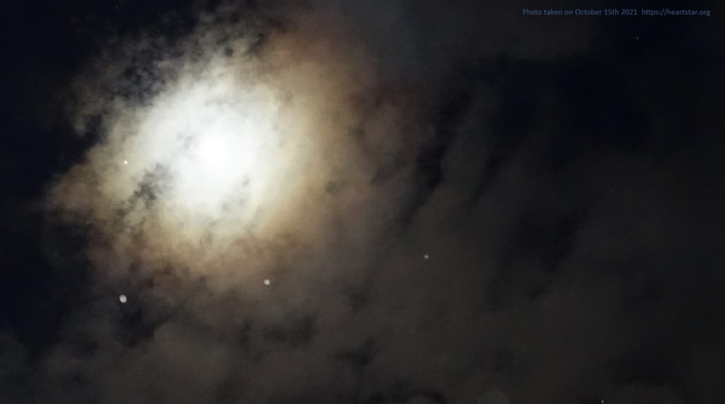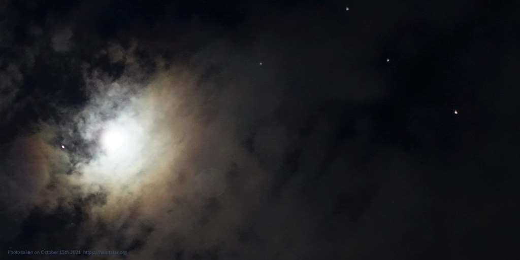 The following day and night the energies went ”through the roof”, with a breathtaking flow of lightships and flashes, synchronized in triangles, arcs and straight alignments near and around the Moon and nearby Jupiter, or around Venus, with Antares just above her…during a highly coordinated sweep of clearings across several fleets and co-Commands that displayed precisely and spectacularly in the skies over the next few days. Here’s the first simultaneous ship flash of October 15th, three ships forming a triangle around the Moon.