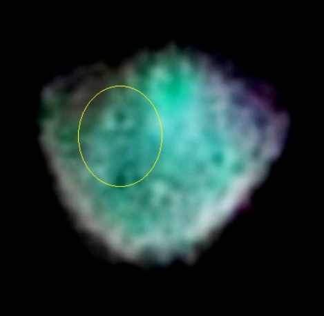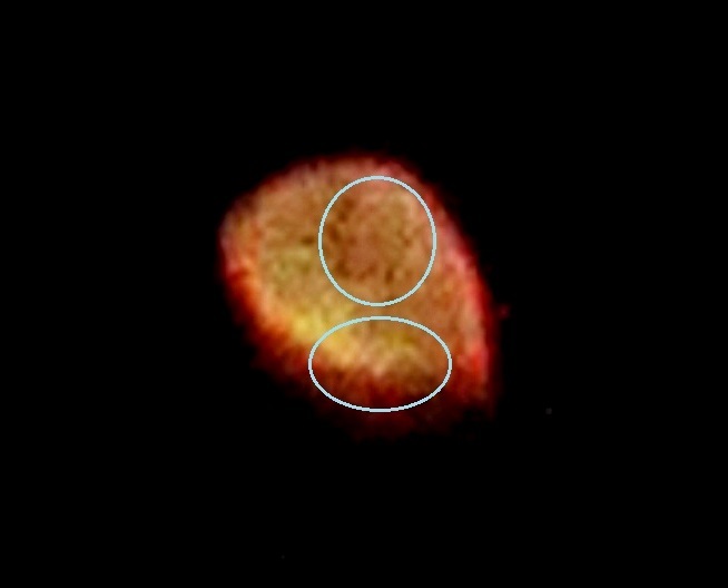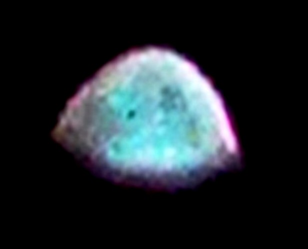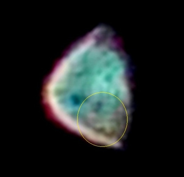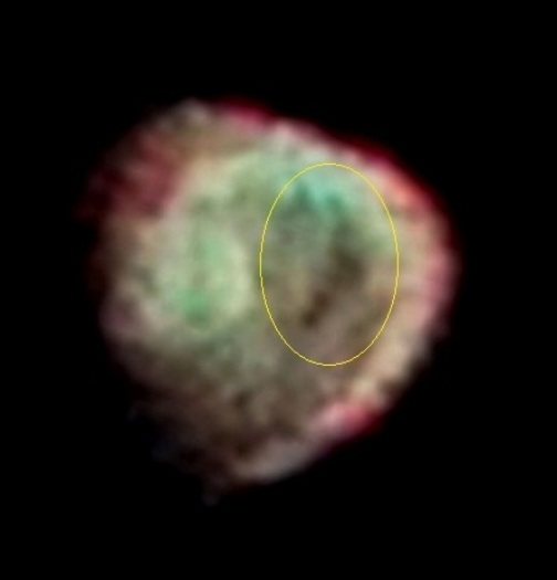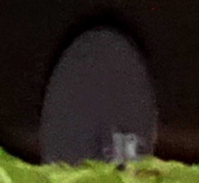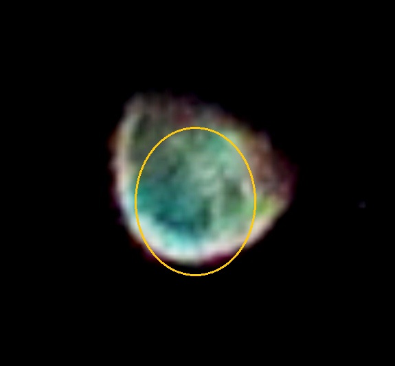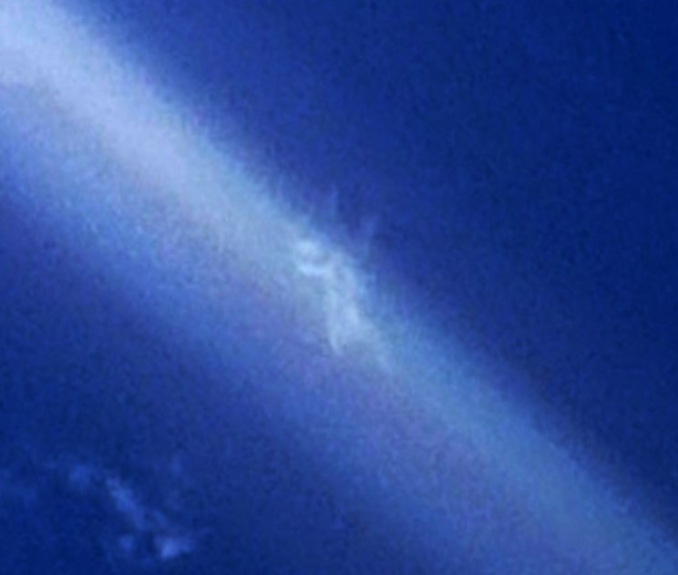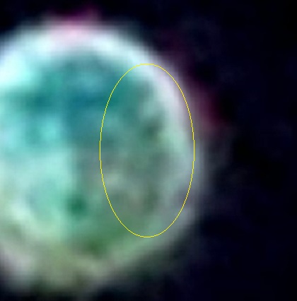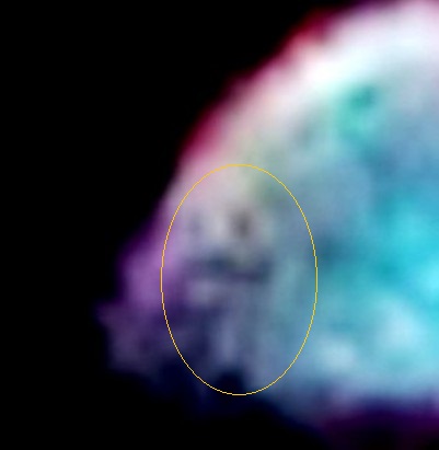 This lovely ”window-view” into a lightship that appeared for a few seconds flying by the Moon on September 24th reveals several forms; clearest is our star brother Yuthi in the centre (under the white light upper centre of this emanation/interior view), with some of his family members at right (appearing to me as a lady, with a small girl in front of her), easier to see with heightened contrast in the second enlargment below.