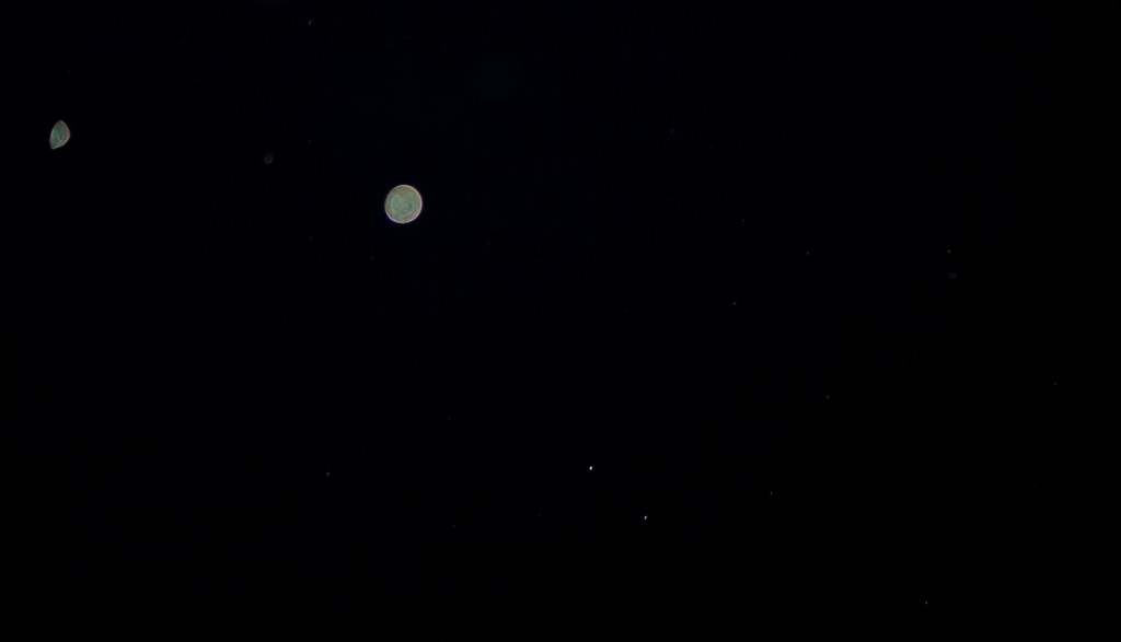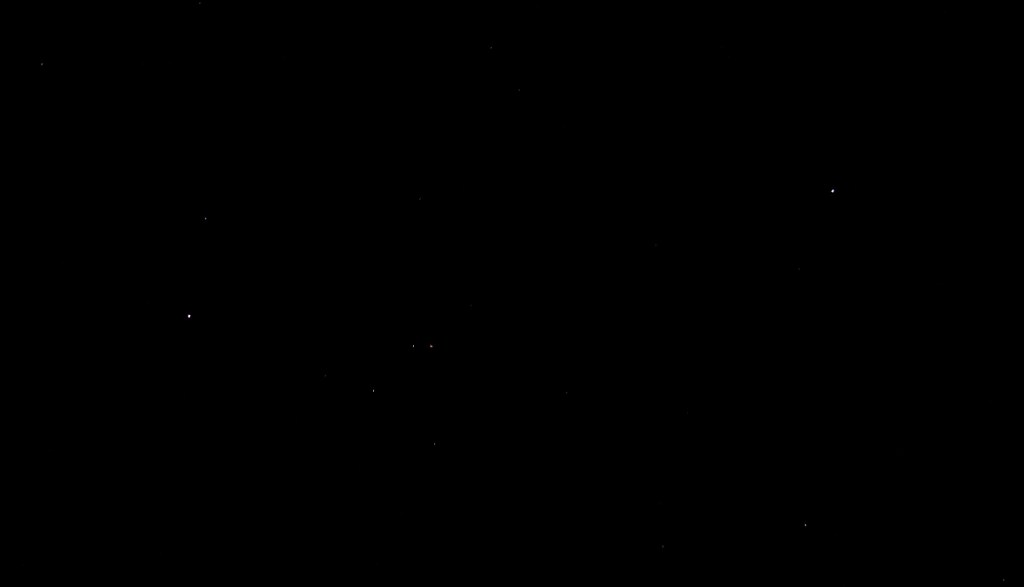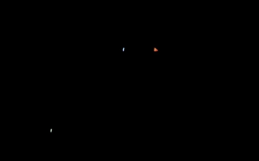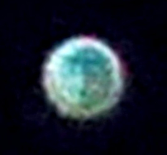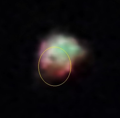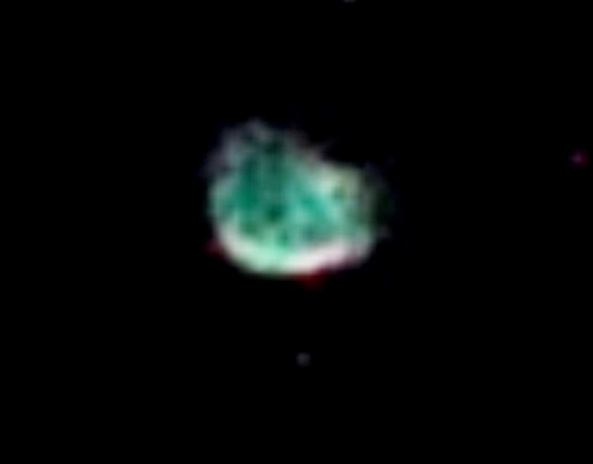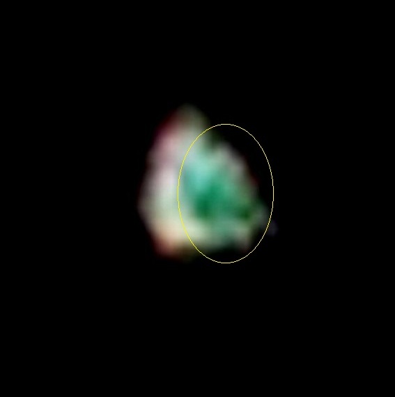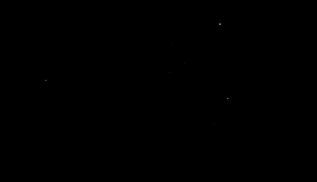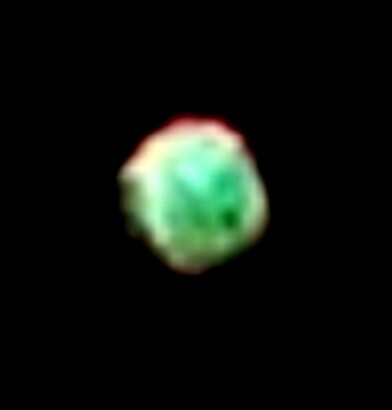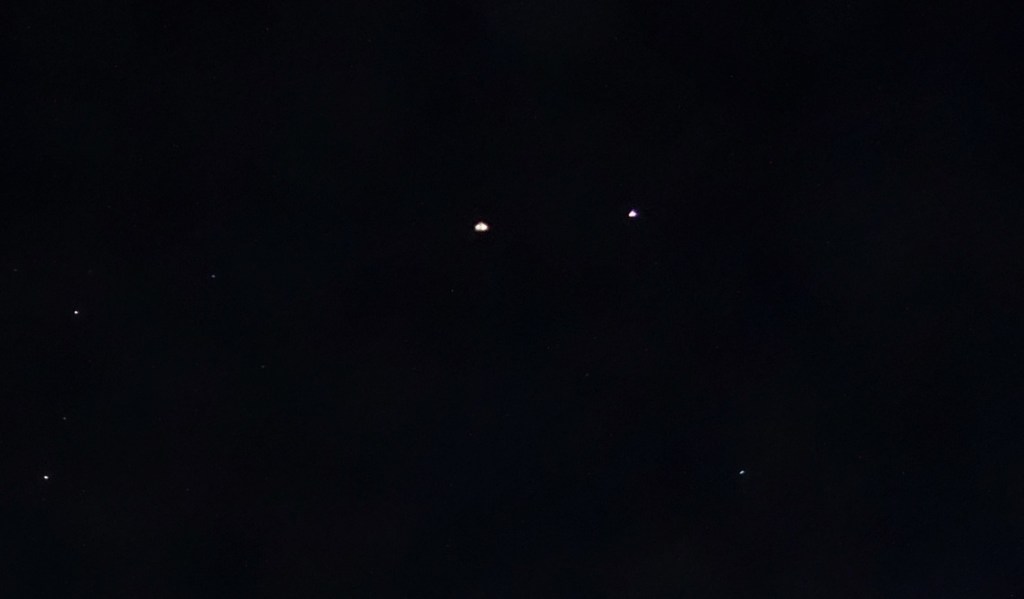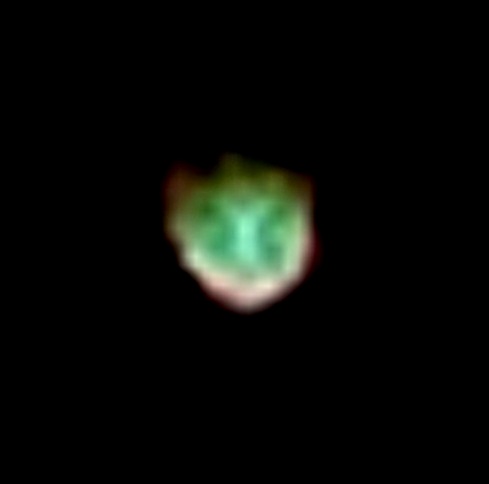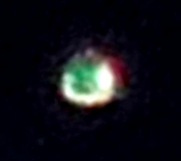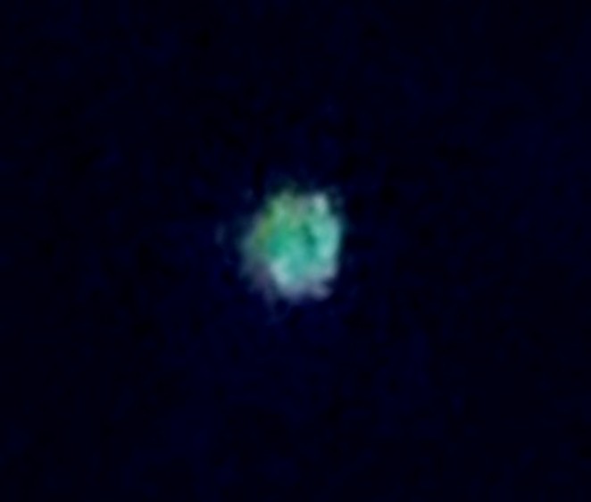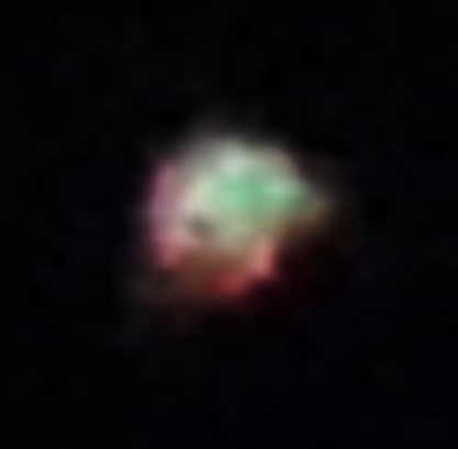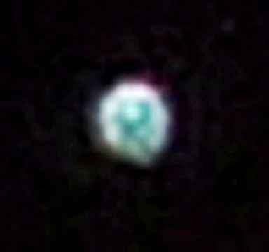 This was followed by a line-up of orbs between Sirius and Canopus, with red orbs between the two stars, and a green orb to the right of Canopus. Enlarged, there are figures visible in the green light emanation, quite clear with the contrast increased.