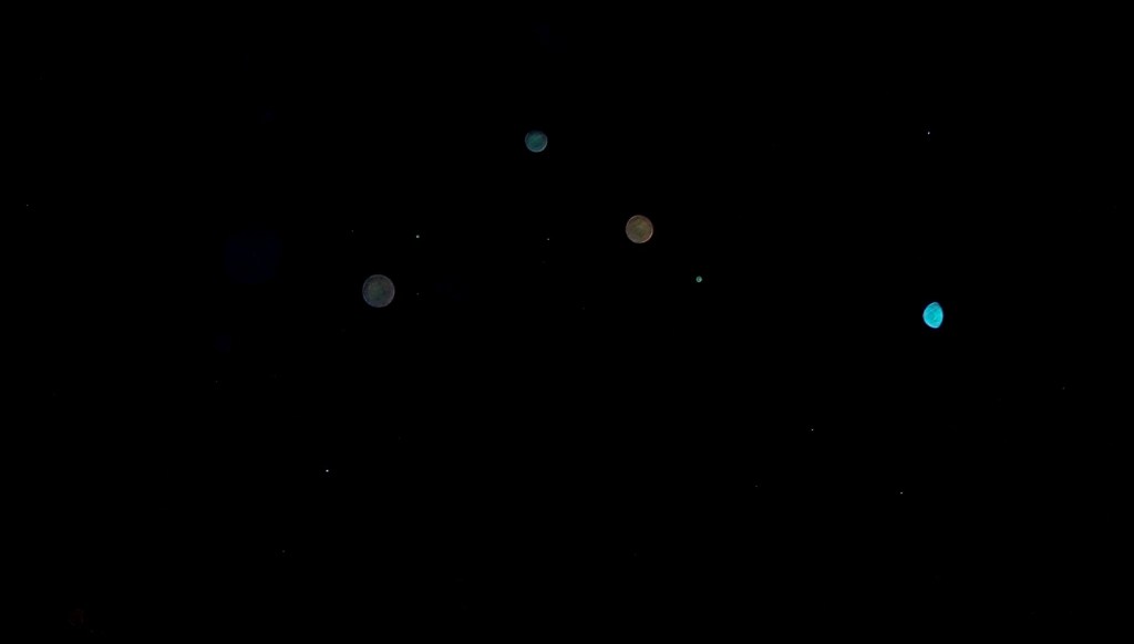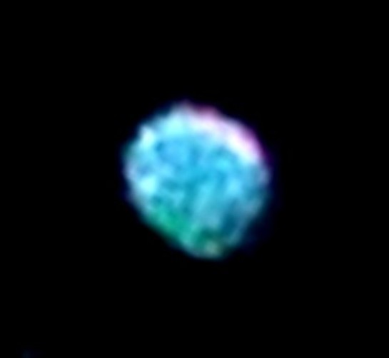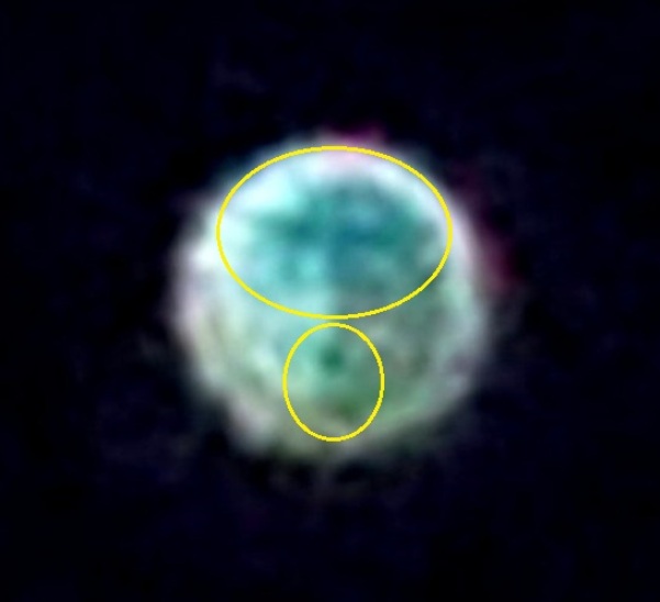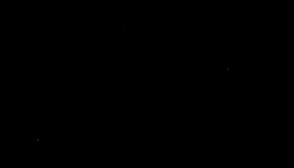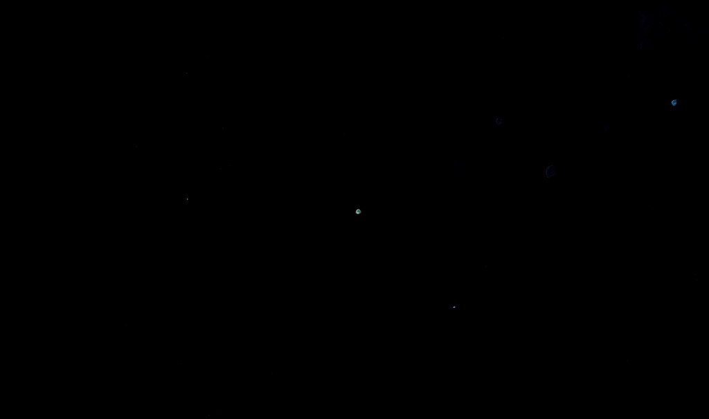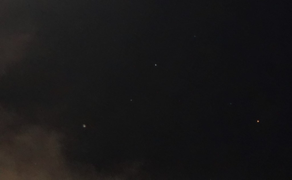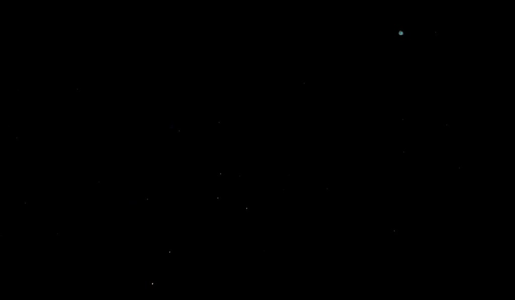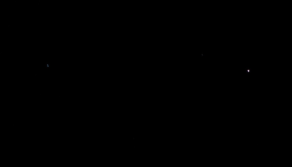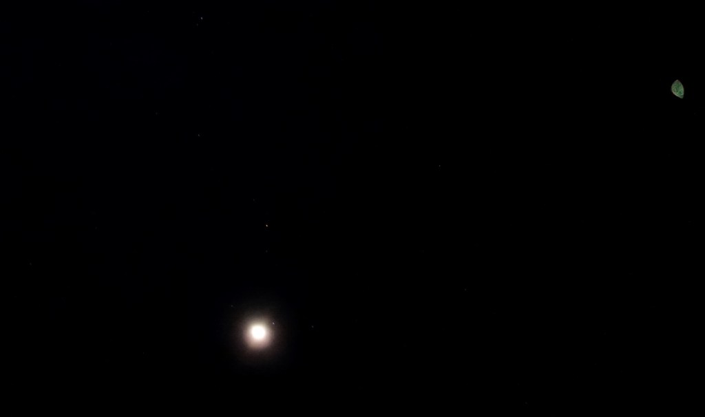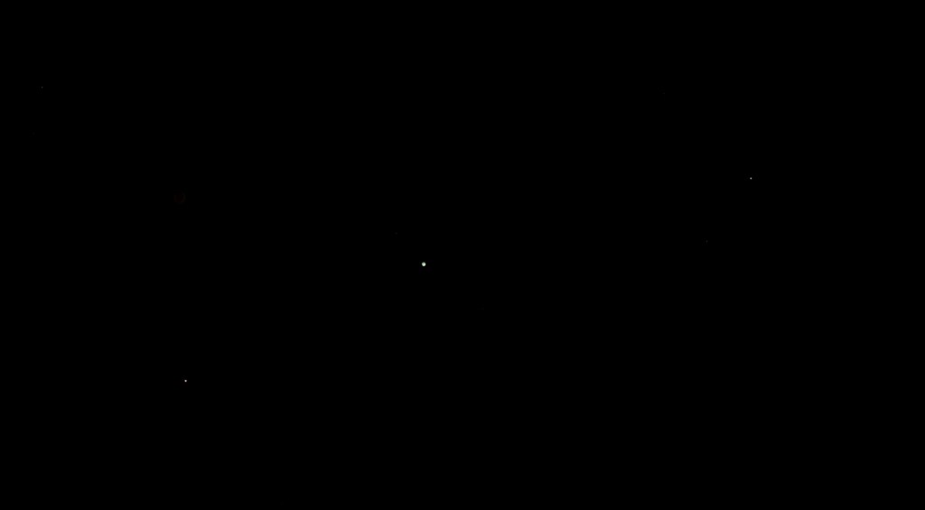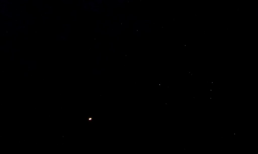 This was followed by a line-up of orbs between Sirius and Canopus, with red orbs between the two stars, and a green orb to the right of Canopus. Enlarged, there are figures visible in the green light emanation, quite clear with the contrast increased.