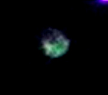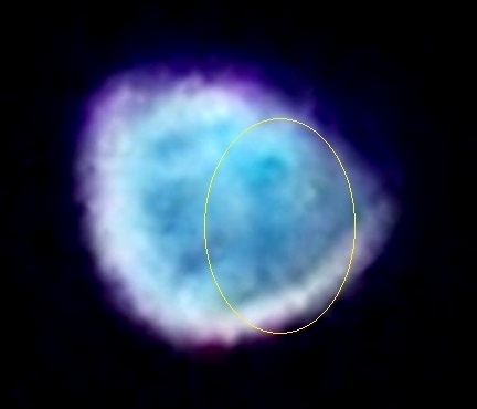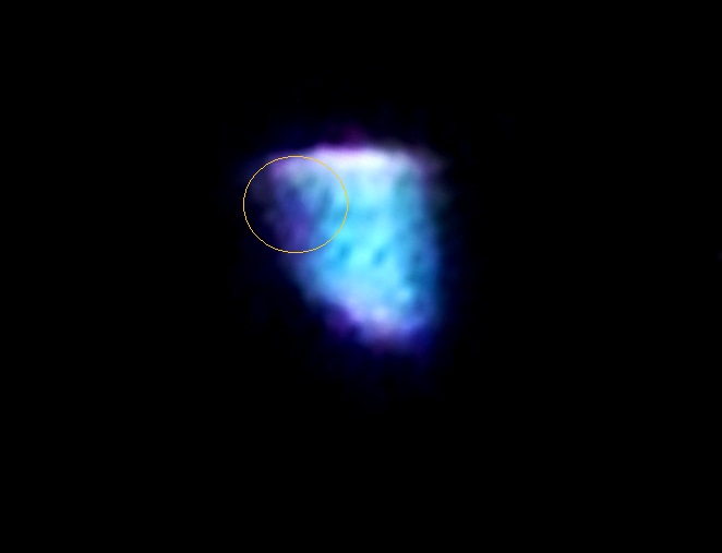 Then the first ship decloaked briefly, flashing lights at either side of its rim, but in the photo the ship isn’t visible, except as a sort of swirly energy patch between/around the two bright white lights.