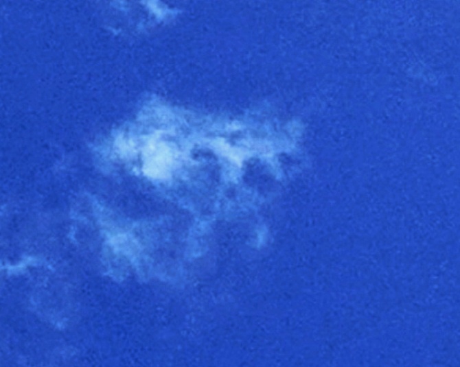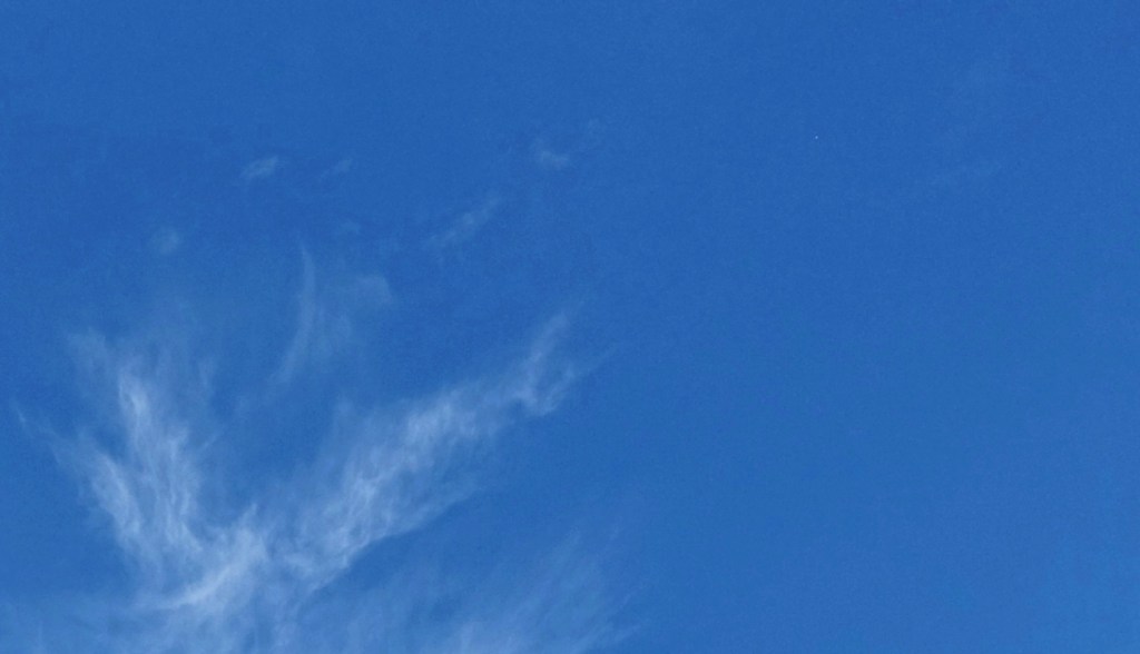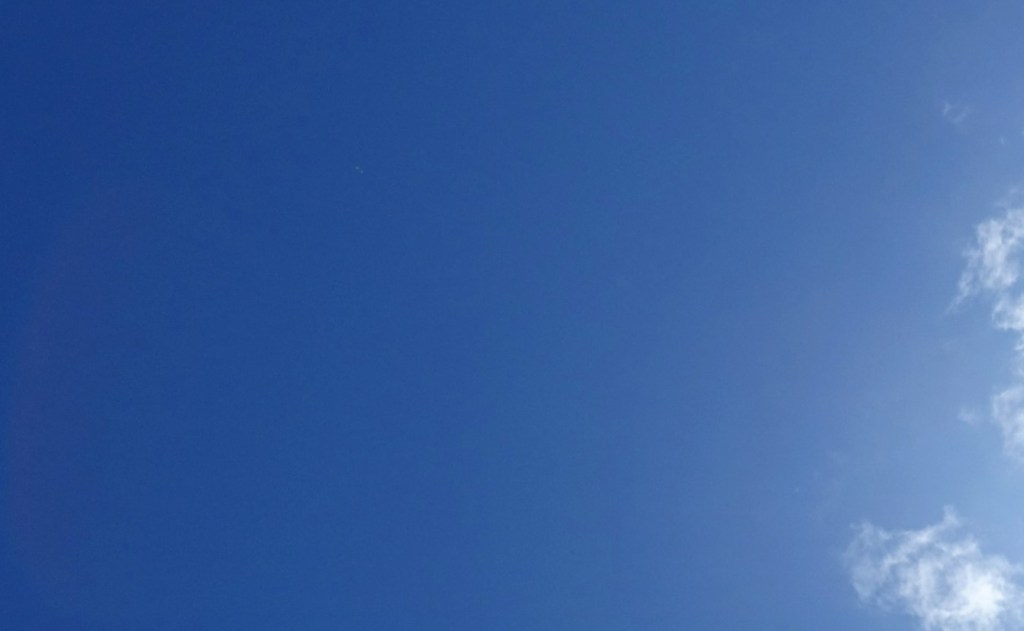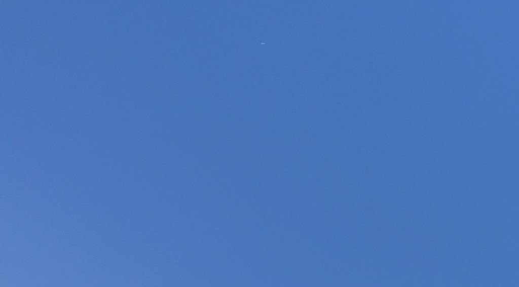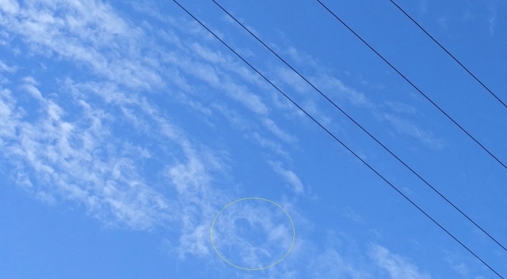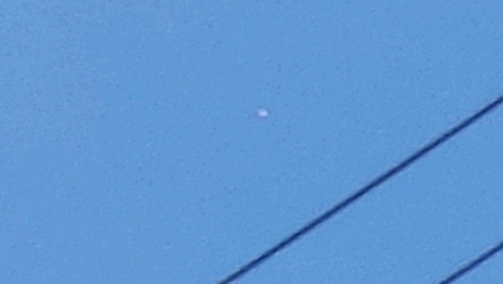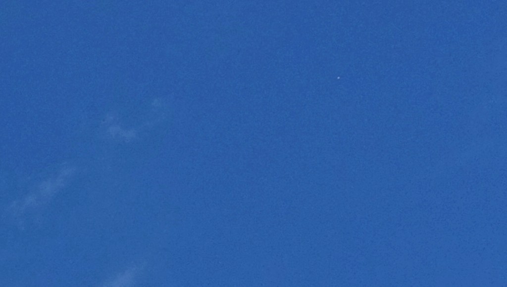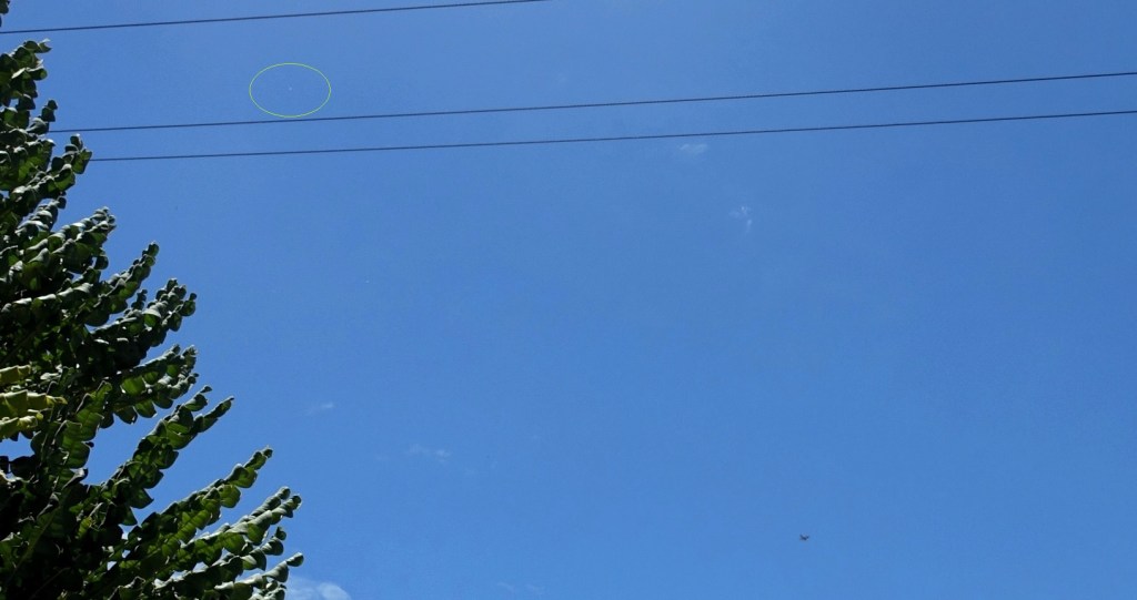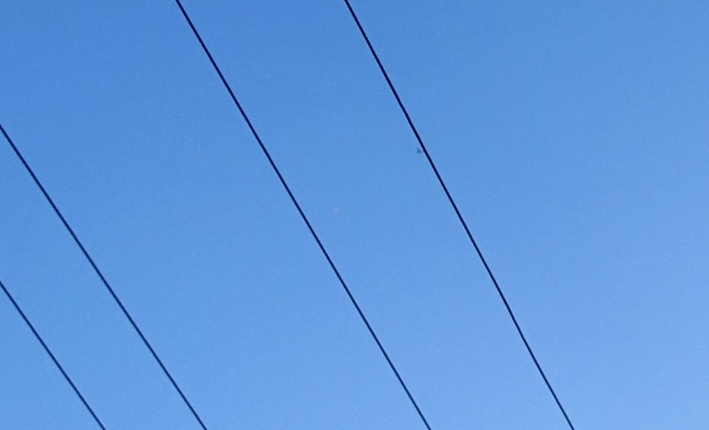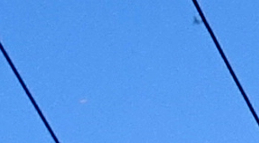 During the morning of January 27th, the sky was busy, firstly with a ship (a golden-white disc again) flashing into view in front of a plane. The plane was visually clear, but in the photo to my surprise looked more like a smudgy dark blue bird shape. Higher overhead, a pair of military jets were passing back and forth, with a helicopter below, it was petty hectic for half an hour or so.