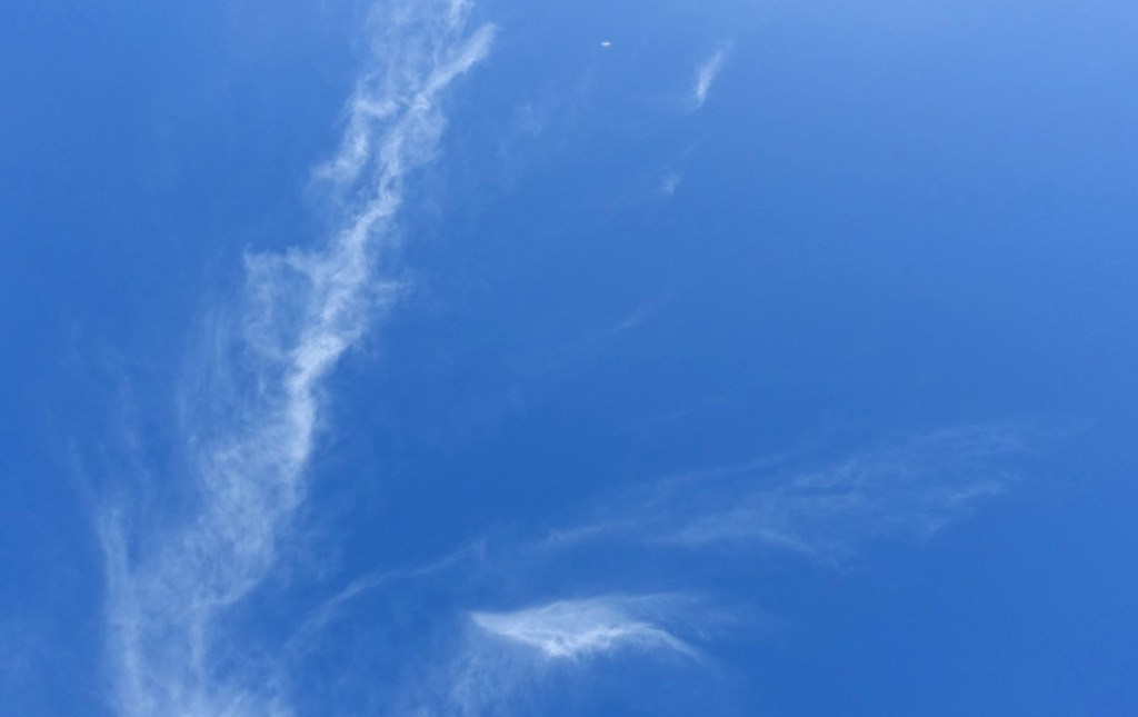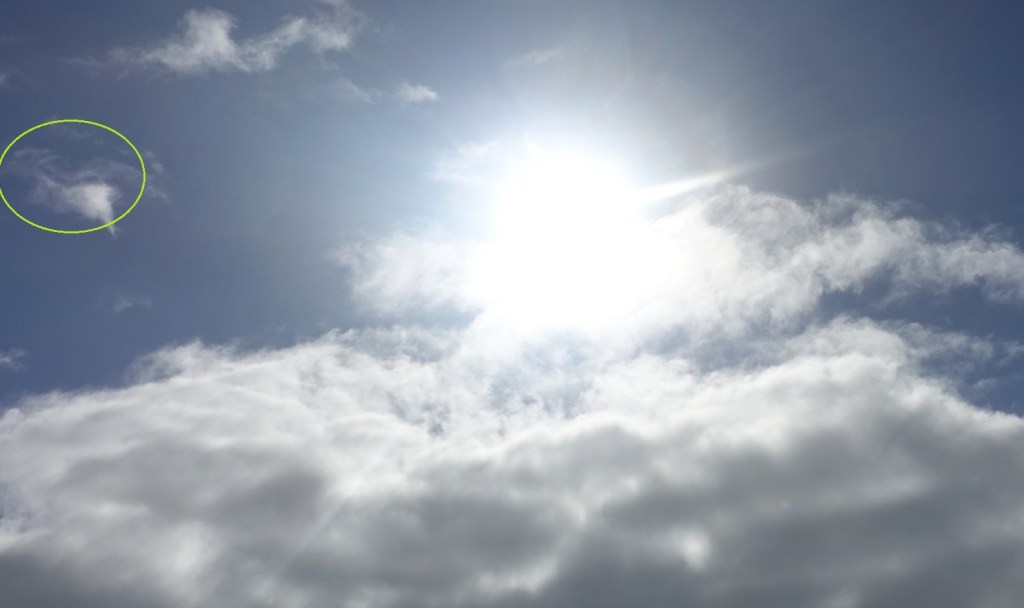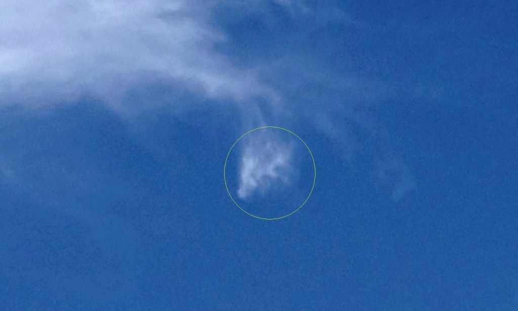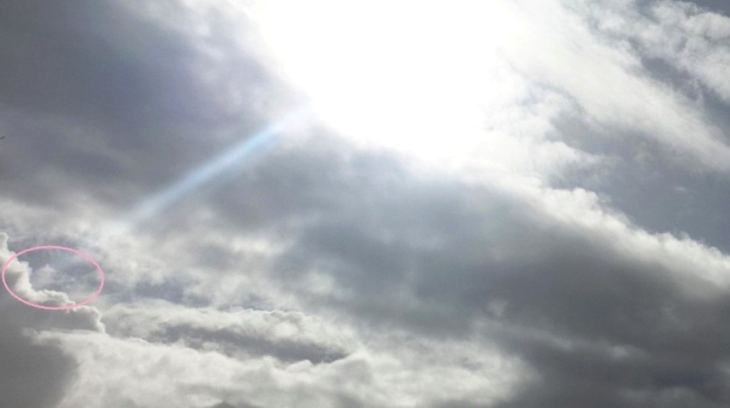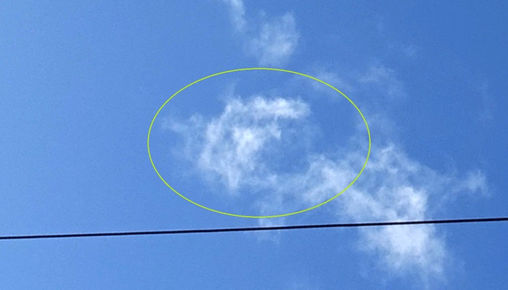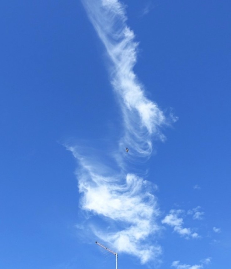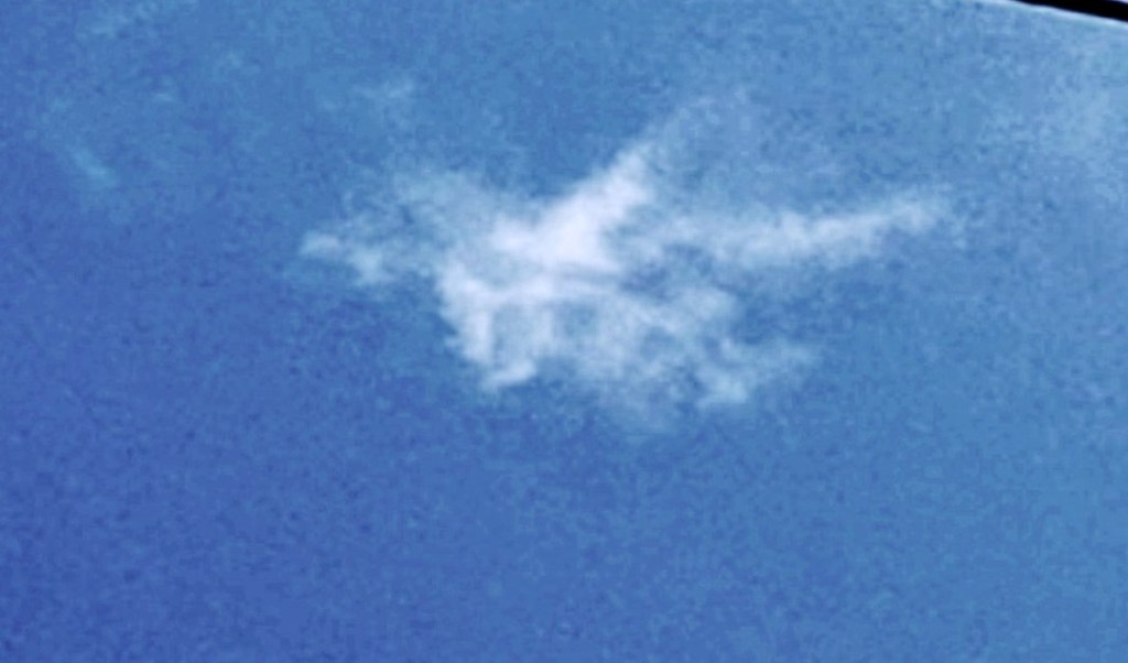 Coming into May 15th, I woke from a ”dream” of streams of energy flowing to the Earth that felt beautiful and supportive, and pathways being cleared to allow them to ”land” in various points/nodes around the planet. Later that day, on being called outside, this unique looking cloud formation banded the sky, with a lightship flashing just near its tip. The ship appeared in several frames, before another extremely bright lightship flashed higher up, moving slowly, across several frames. The spiralling pillar-like cloud then aligned vertically, straight above the aerial on the roof, and a bird plummeted vertically down the cloud spiral before flying away. The sense of energies anchoring felt complete at that moment…and from then, the clouds dissipated and no more ships appeared visibly that day.