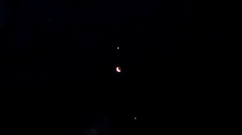 On April 23rd, she appeared for a moment to the right of Alpha Centauri and the Southern Cross, again in a triangular appearance, but doubled, with a ”visual echo” behind the bright foreground triangle…with, as they put it metaphorically, the butterfly’s wings just beginning to open.