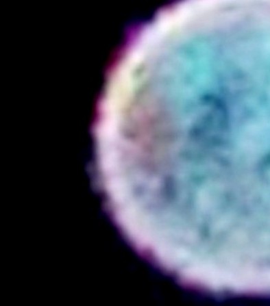 This small bluish coloured orb hovering above the Moon on September 28th shows a clear face, round and with large round eyes, within a triangular frame in the lower centre part of the orb when enlarged.