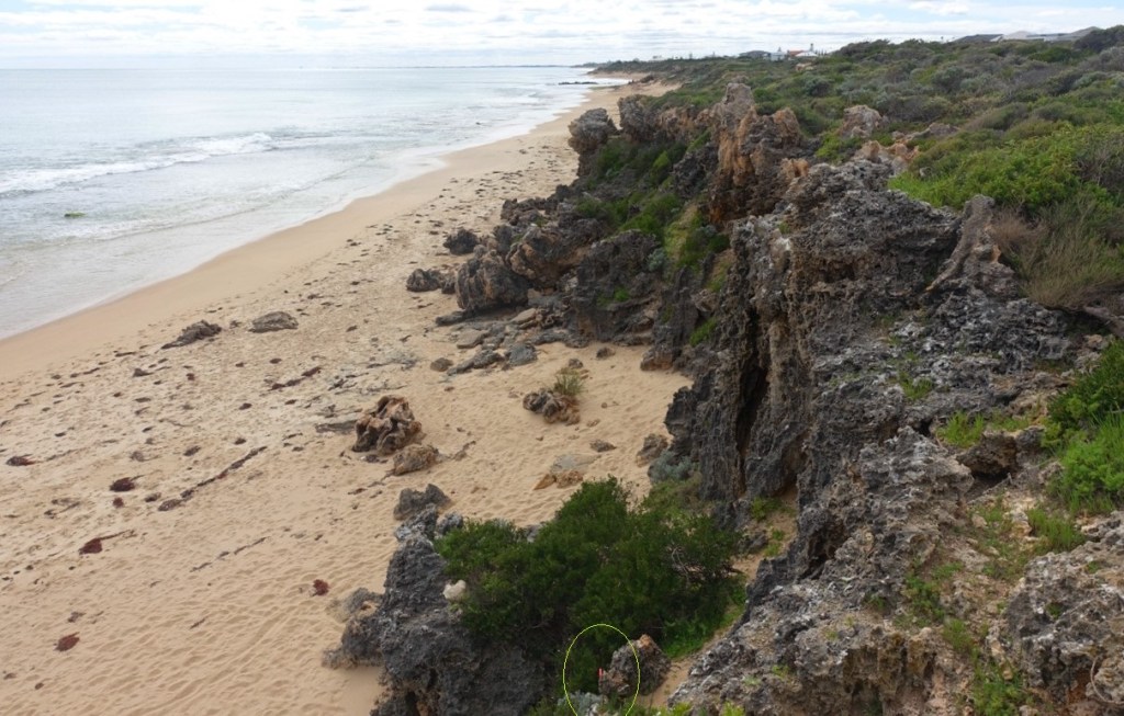 The next morning, on August 29th, while attuning with the Terebinth lightship of the Tara fleet above the coast at Hall’s Head in Mandurah, a ruby beam flashed downward, and can be seen ”landing” among limestone outcrops as an intensely bright red-white vertical light beam (visible for only a second, but recorded at the moment of grounding into the earth in the photo below, circled at the foot of the frame).