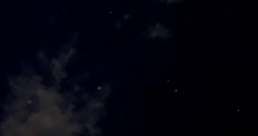There were beautiful orbs that night, centered around Sirius and Canopus, and culminating in a ship flash right beside Sirius. The orbs danced in a wonderful counterpoint in gold and white, with the golden orbs next to Sirius and pearly white orbs next to Canopus, one after another in sequence. Here are some of them, beginning with a golden-white orb above the two stars, closer to Sirius.