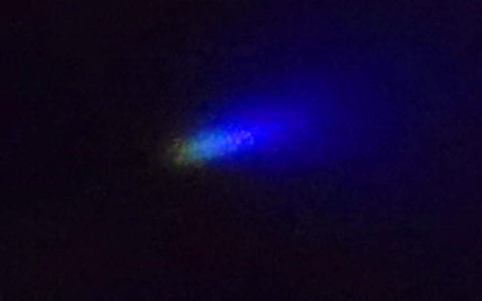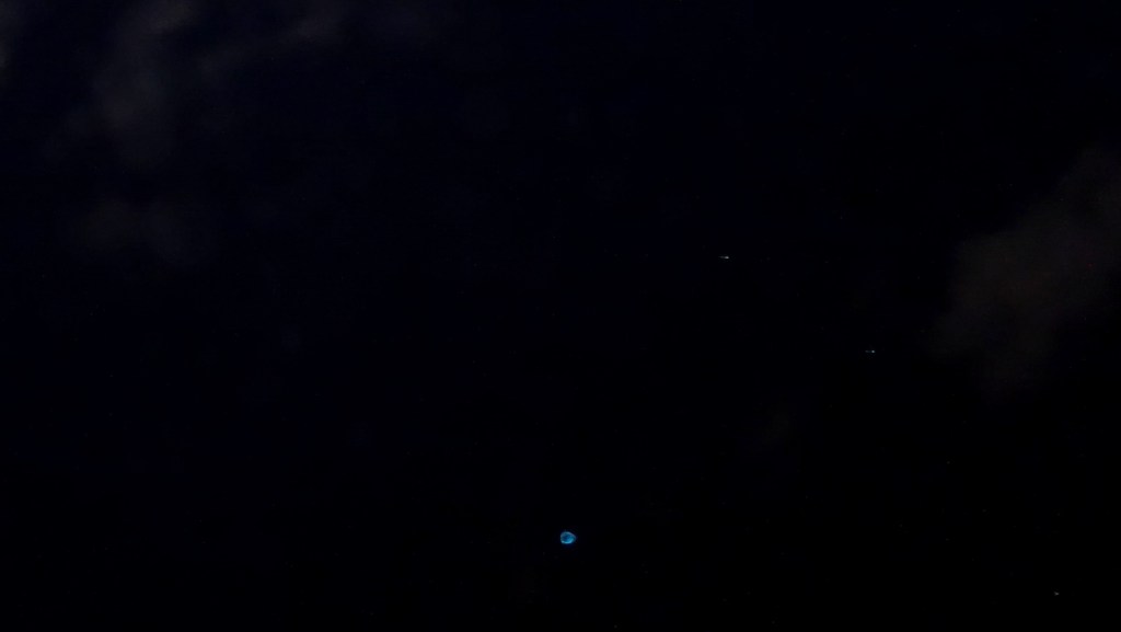 The particular shade of blue orbs tinged with purple continued to appear above or beside the star Achernar throughout the following week. Here’s one that appeared on December 14th in two frames above Achernar, along with constant twinkles from ships around that star.